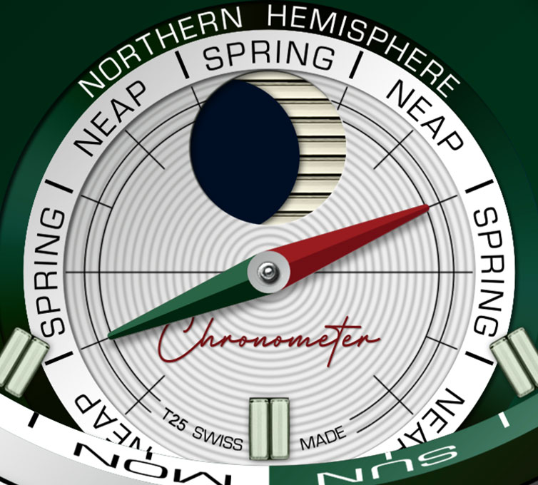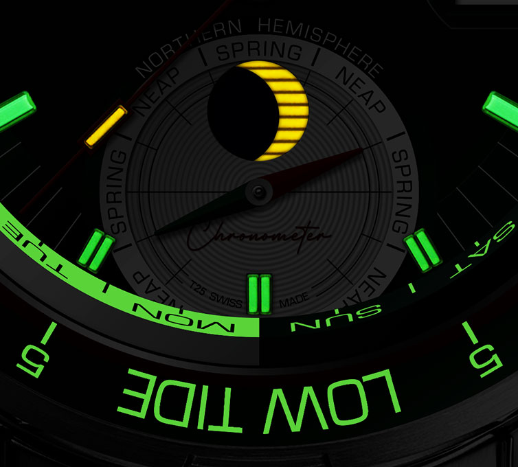 大潮は干満差が最も大きく、新月または満月のタイミングで発生する。小潮は干満差が最も小さく、半月前後に生じる。文字盤6時位置のサブダイアルが現在の潮の強弱を示し、「Spring」で大潮、「Neap」で小潮を表示する仕組みである。