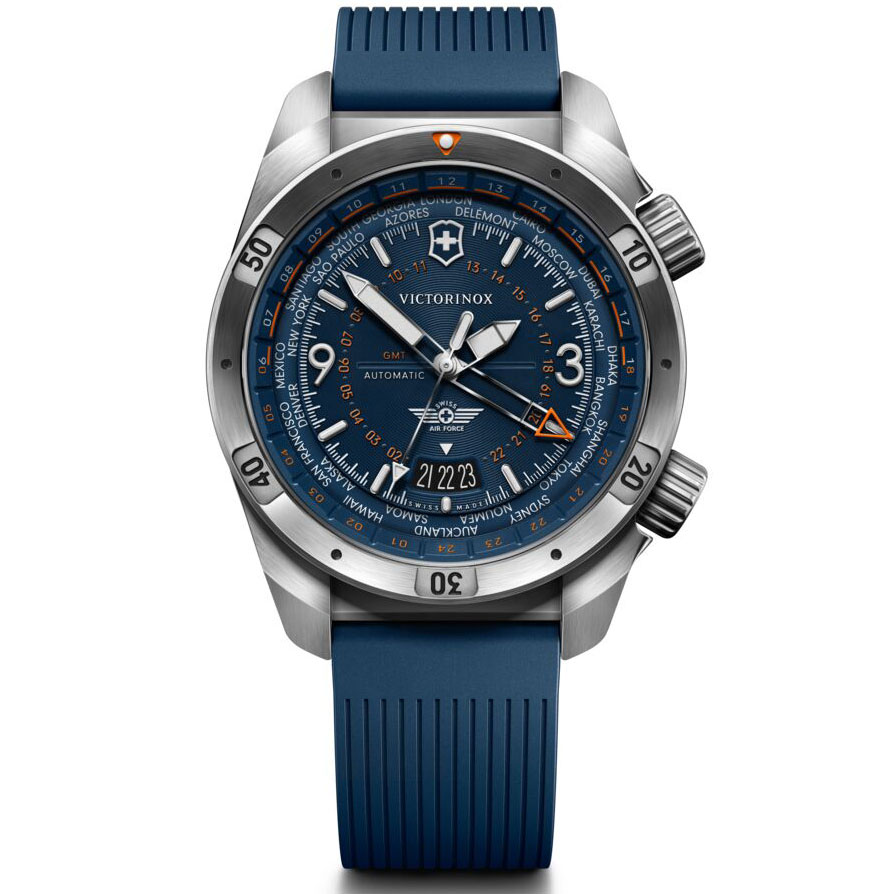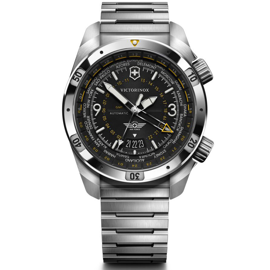 ビクトリノックス「エアプロ GMT オートマティック」 Ref.242004 33万円/自動巻き(Cal.セリタ SW330-2)、56時間パワーリザーブ。ステンレススチールケース&ブレスレット、サファイアクリスタル風防。直径43mm。20気圧防水。