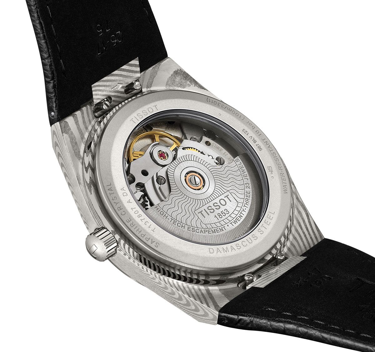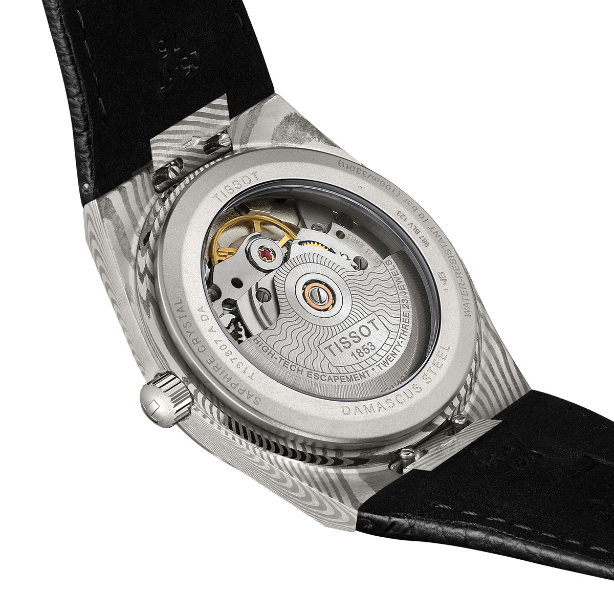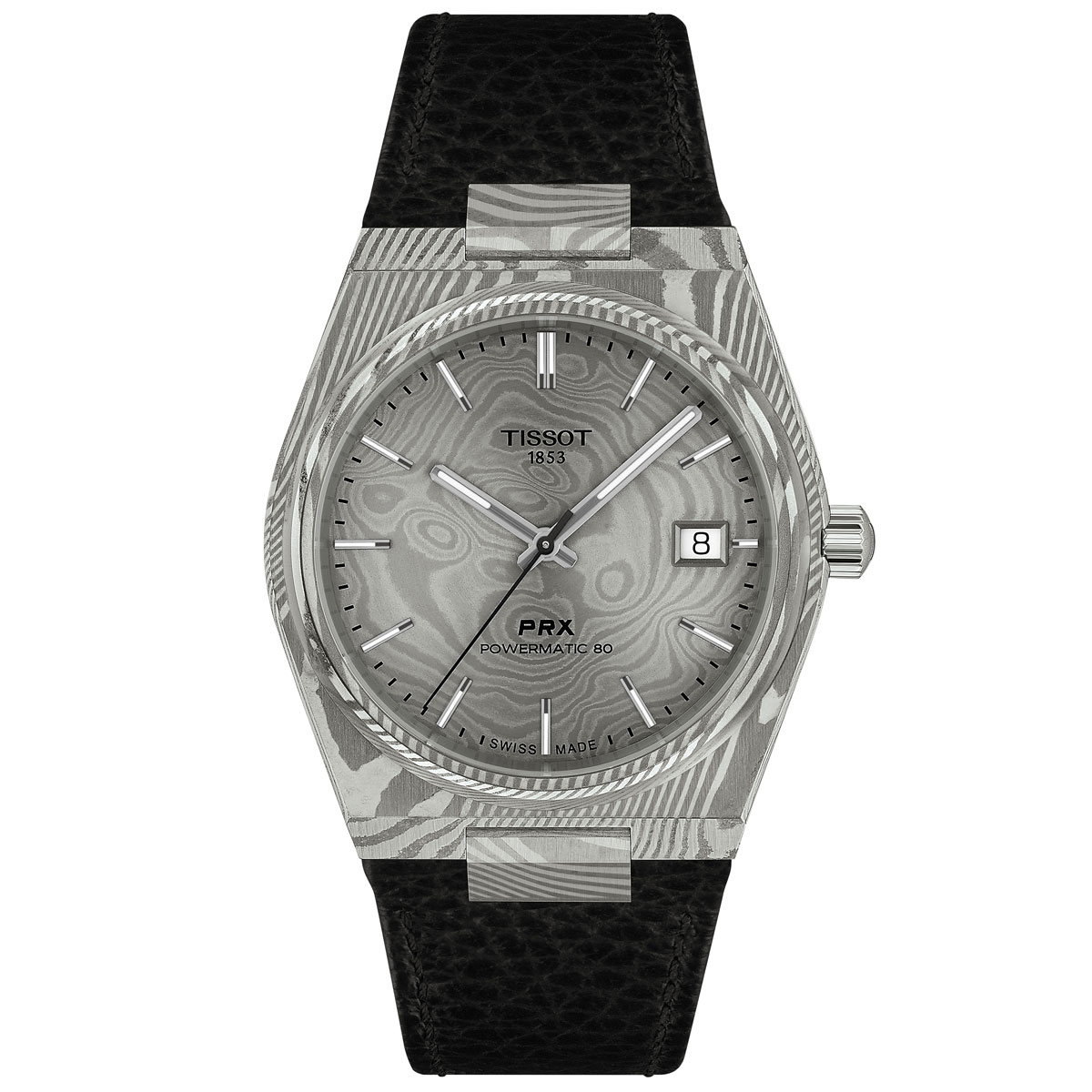 ティソ「ティソ PRX ダマスカス スティール 38mm」 Ref.T137.807.96.081.00 16万1480円/自動巻き(Cal.パワーマチック80)、毎時2万8800振動、80時間パワーリザーブ。ダマスカス・ステンレススチールケース(シースルーバック)、レザーストラップ、サファイアクリスタル風防。直径38mm、厚さ10.98mm。10気圧防水。