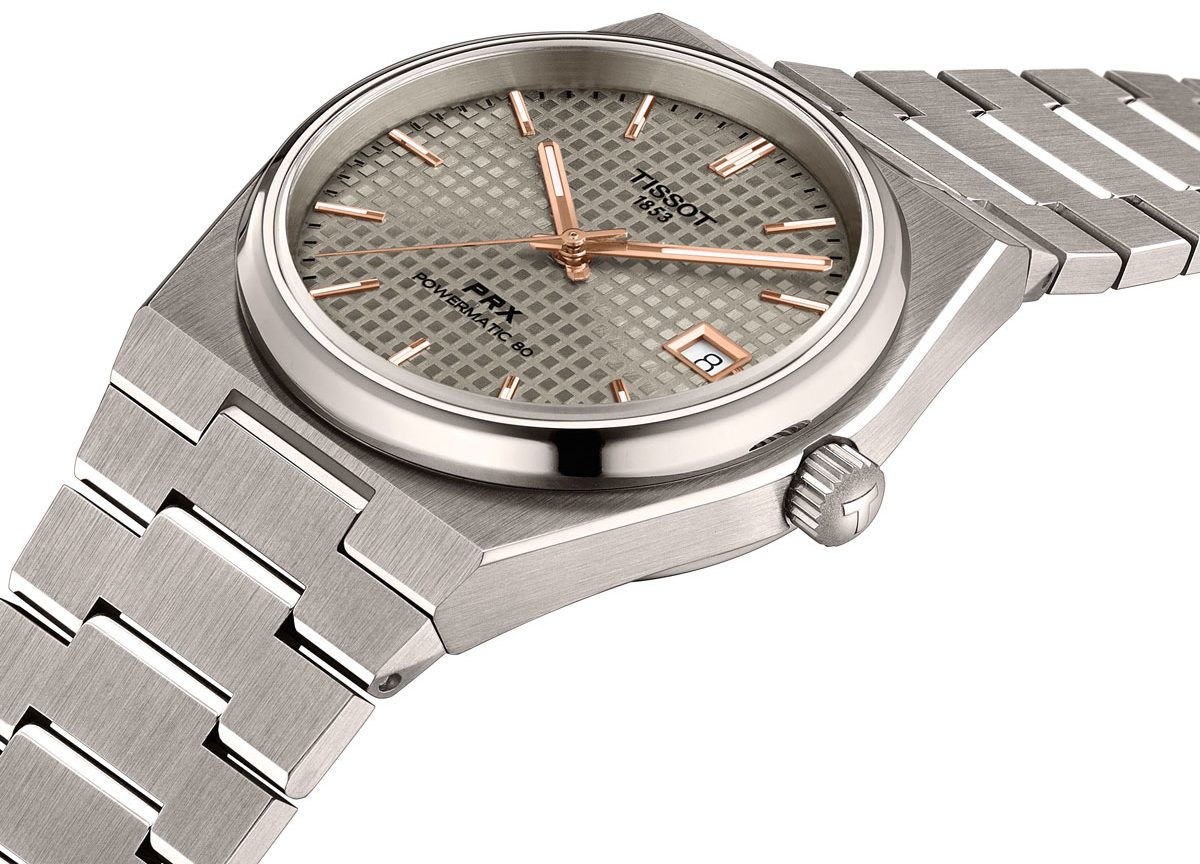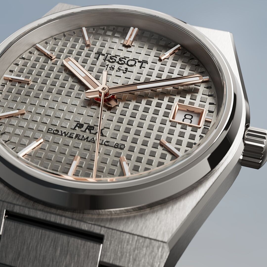 ケースと一体型ブレスレットにチタニウムを採用した2モデルは、羽のように軽く、卓越した強度を誇る。柔軟性に富み、重みを感じさせることなく手首に快適にフィットし、あらゆる冒険のパートナーとして最適である。ディープブルー文字盤にニッケル仕上げのバトン針とアプライドインデックスを組み合わせたモデルと、グレー文字盤にローズゴールドの針とインデックスを配したモデルの2種類が登場する。いずれもPRX パワーマティック 80の象徴的要素であるワッフルパターンの文字盤を備え、コレクションの大胆でモダンなスピリットを強調しつつ、優れた視認性を確保する。