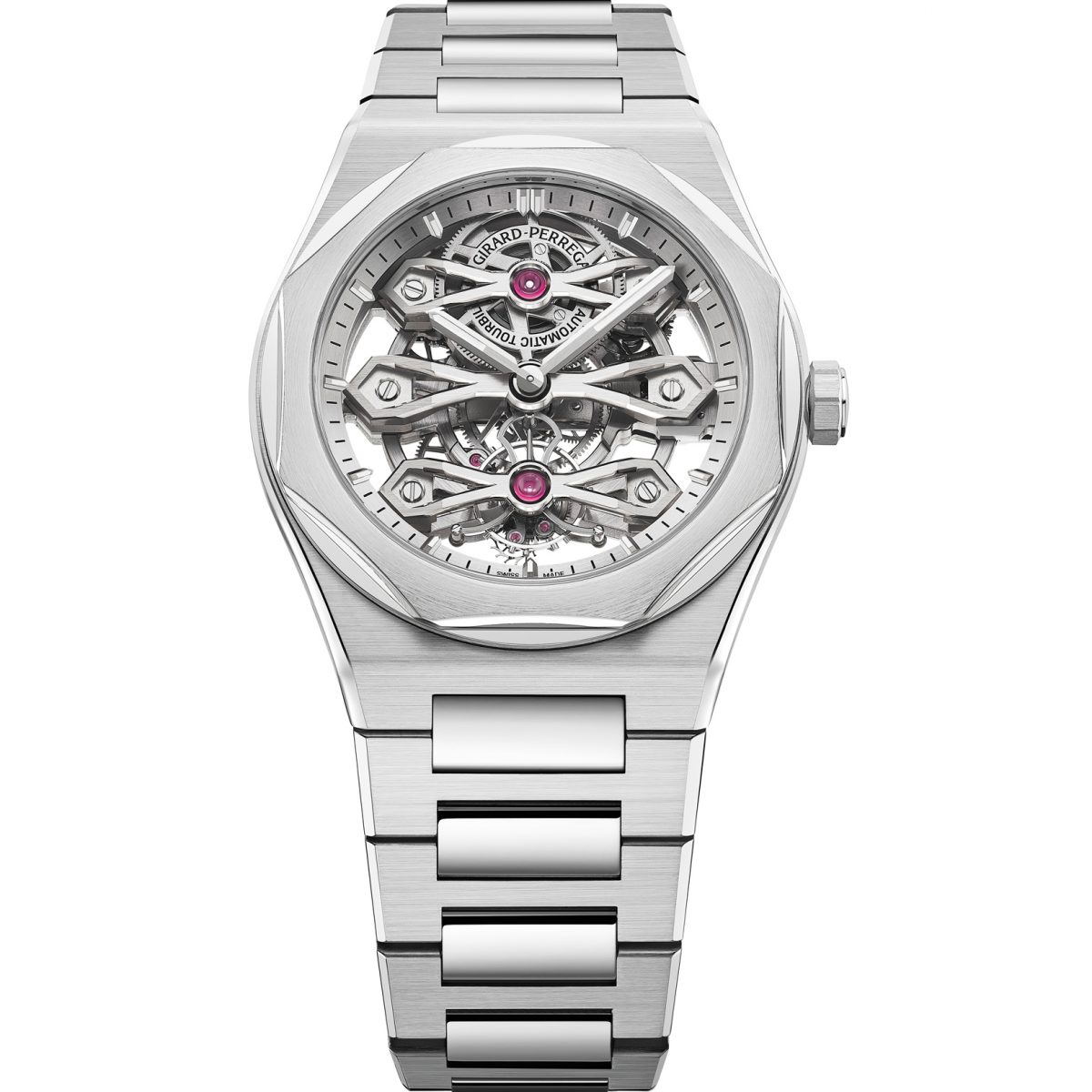 ジラール・ペルゴが1867年に発表したスリー・ブリッジの意匠が、現代のロレアートと融合した世界限定50本のスペシャルピース。人間工学に基づいて設計された直径41mmのステンレススチールケースに八角形の18Kホワイトゴールドベゼルをセット。伝統のH型ブレスレットへと流麗につながるフォルムが、独創スケルトンキャリバーと相まってこのうえない存在感を放つ。