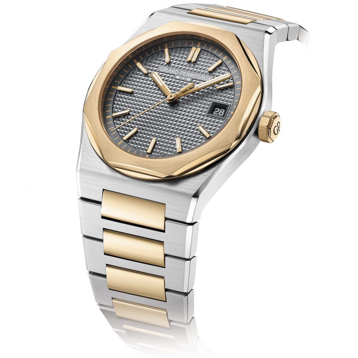 新作「ロレアート フィフティ」は、数年間に及ぶ開発期間を経て完成した新型キャリバーGP4800を搭載。自動巻きながら薄型設計で、ケースの厚みも10mmを切るスリムな新型ケースとなった。外装の特徴的なポリッシュ面はレギュラーモデルよりも幅が広く、バイカラーの煌めきを豊かに表現。文字盤はインデックス、針ともにエッジを効かせた多面形状とした。また、同様のカットを秒針後端のカウンターウェイトのアローモチーフにも適用することで、文字盤に調和をもたらしている。