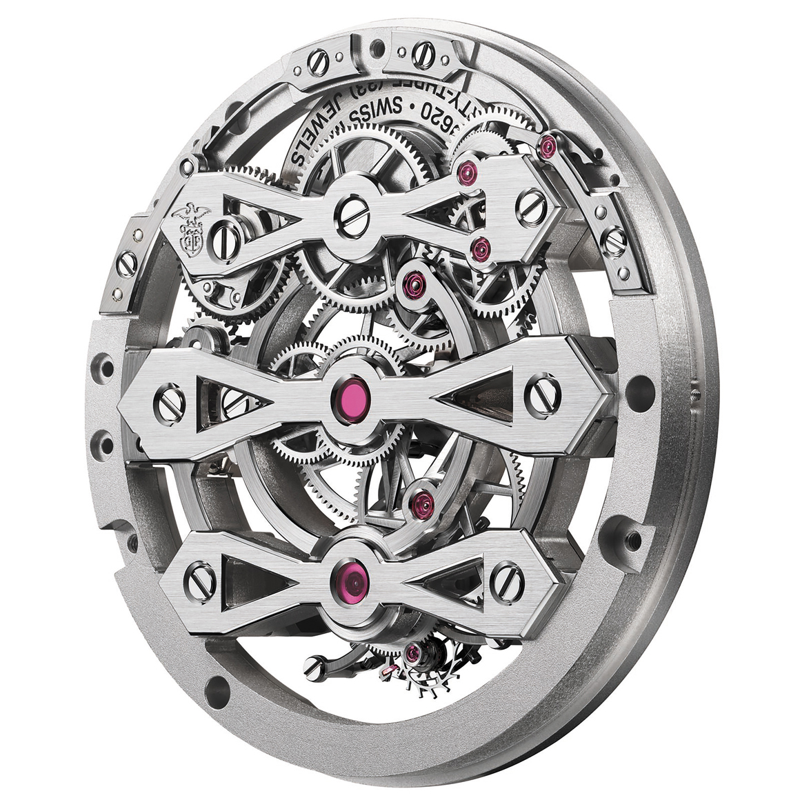 こうした歴史を踏まえて誕生50周年を祝うアニバーサリーモデルの第2弾として発表された「ロレアート スリー・ゴールド ブリッジ」を見ると、この時計がまさしく19世紀から3世紀に渡ってジラール・ペルゴが培ってきたサヴォアフェールを凝縮した特別モデルだと理解できる。表と裏から確認できるスリー・ブリッジの構造は、12時側に特許取得のマイクロローターと同軸の香箱をセット。そこから2番車や3番車、固定4番車を介してトゥールビヨンキャリッジを回転させるカナからエスケープメントを駆動させる仕組みだ。19世紀から継承し続けているこの設計を本機のサイズに合わせて完全新規開発したキャリバーGP9620は、その構造美に加えて仕上げも特筆もので、362の内角を含む418の角に手作業でポリッシュ仕上げを施す。光を浴びて煌めくムーブは、プラチナ製マイクロローターや、ホワイトゴールド製ブリッジ、計算された輪列設計、控えめなサスペンデッドインデックスと共鳴し、腕時計を機械芸術の域へと昇華させている。