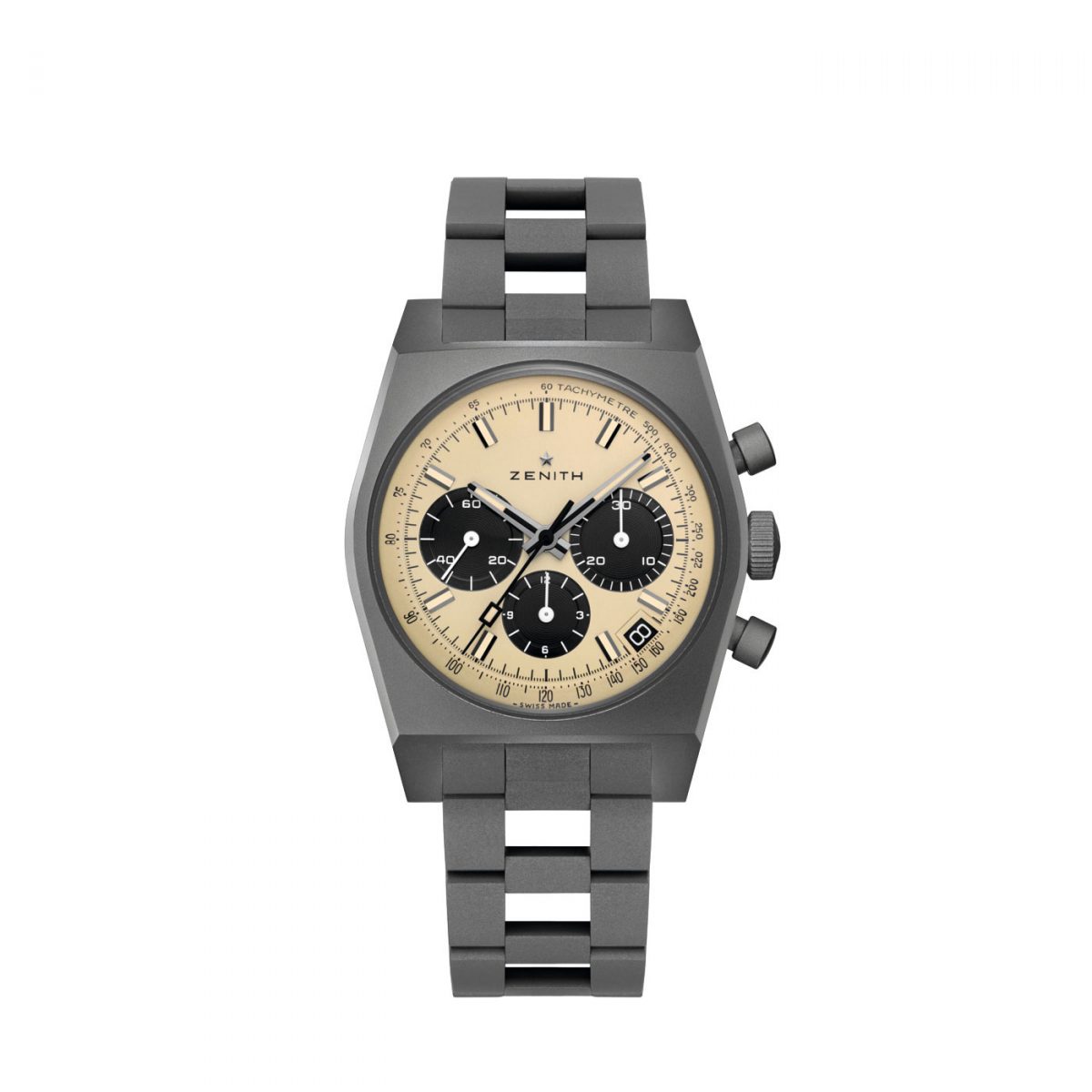 さらに、著名なブレスレットサプライヤーのゲイフレアー社が1969年、ゼニスのためにデザインしたラダーブレスレットを備える点も見逃せない。「A384」や「A386」といった初期のエル・プリメロ搭載機に採用されたラダーブレスレットは、中央のリンクが交互に中抜きされるその構造により、快適な装着感と卓越した軽量性で知られる。本機では、このラダーブレスレットをマット仕上げのチタン素材でリバイバルさせ、ゼニスの歴史的ヘリテージと現代的な人間工学を融合させている。