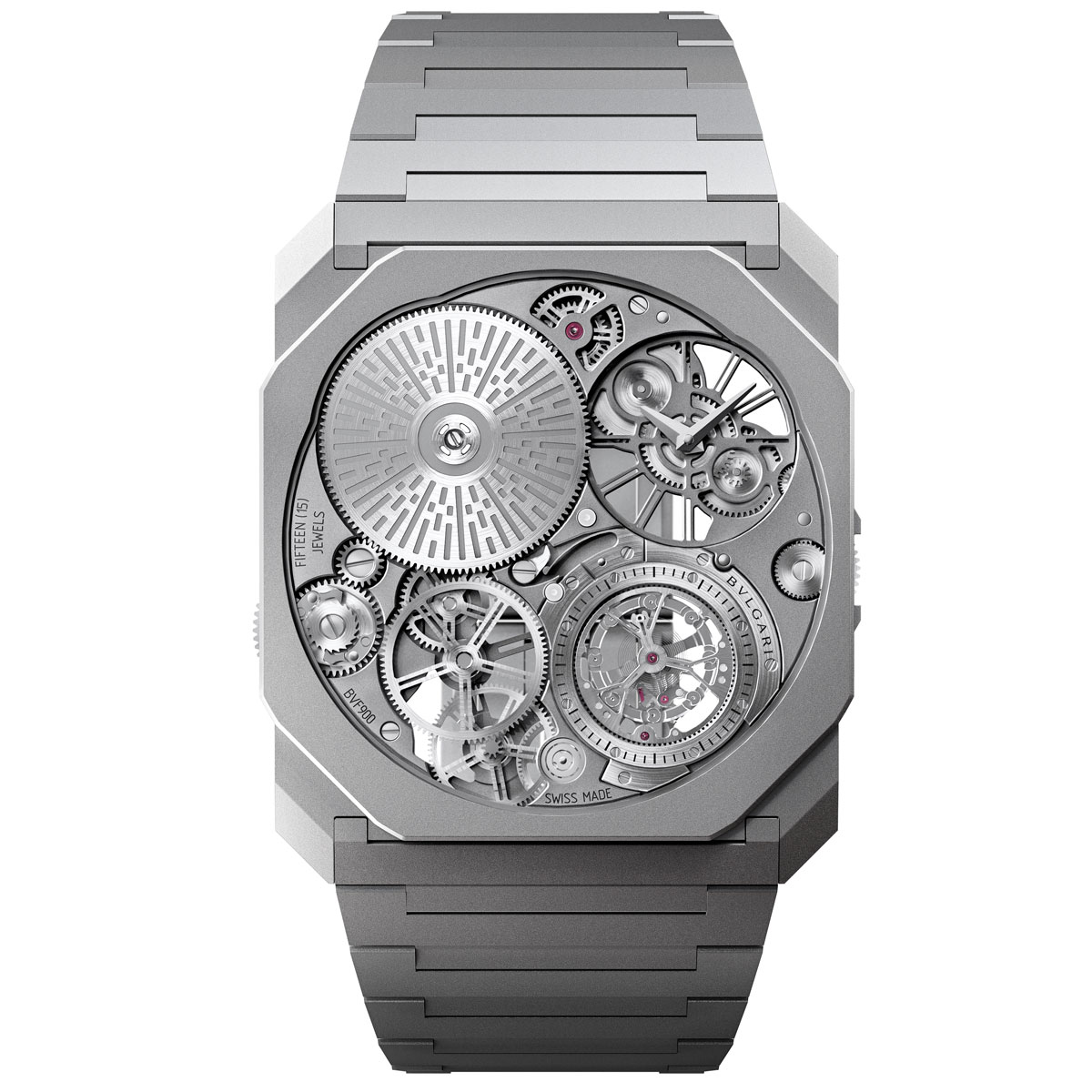 ブルガリ「オクト フィニッシモ ウルトラ トゥールビヨン」 Ref.104313 価格問い合わせ/手巻き(Cal.BVF900)、毎時2万8800振動、42時間パワーリザーブ。チタンケース(シースルーバック)&ブレスレット、サファイアクリスタル風防。直径40mm、厚さ1.85mm。