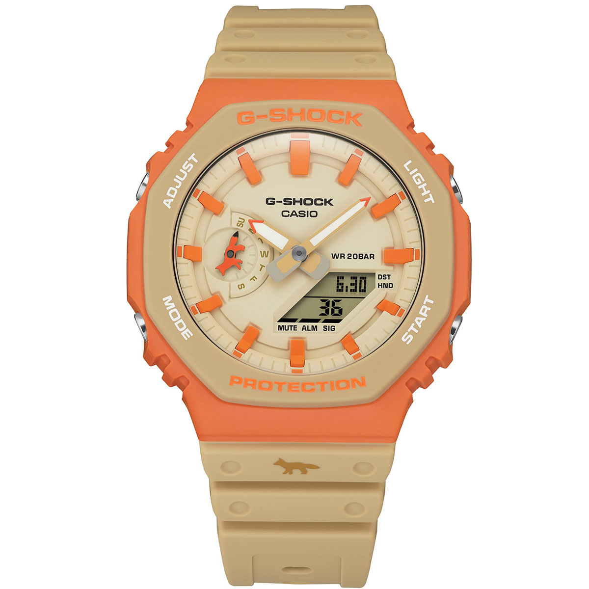 「GA-2110MK-5AJR」のデザインの核となるのは、パリのハウスマン様式建築に着想を得たカマイユ調のナチュラルトーンだ。ニュートラルで落ち着いた色合いに、パリの夕陽を思わせる鮮烈なオレンジのベゼルが映え、クラシックでありながら現代的なムードを成立させている。また、「Maison Kitsuné」を象徴するフォックス(キツネ)エンブレムを9時位置の小針やバンド付け根にあしらい、遊環と裏蓋にもブランドロゴを刻むことで、コラボレーションモデルならではの特別感を強調した。