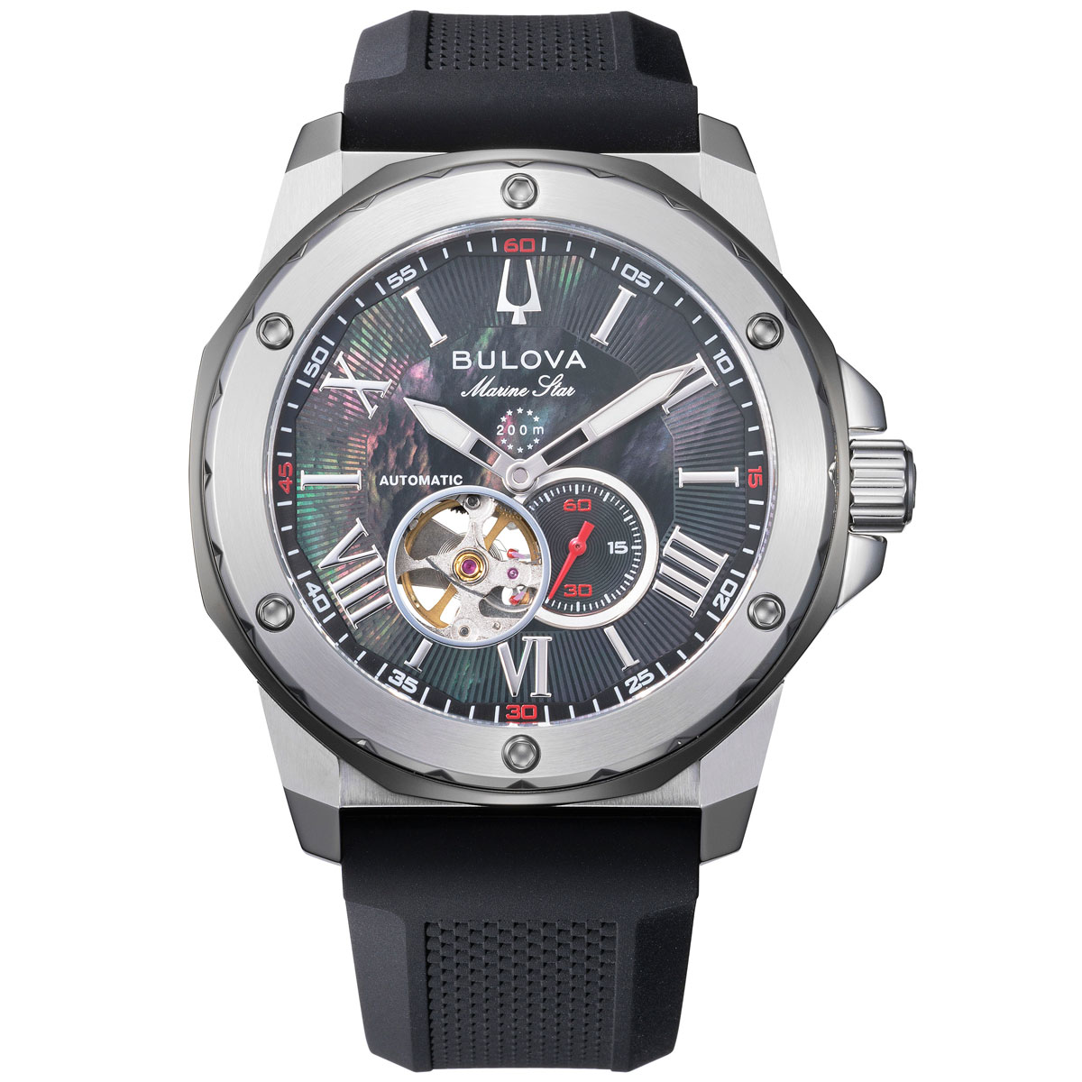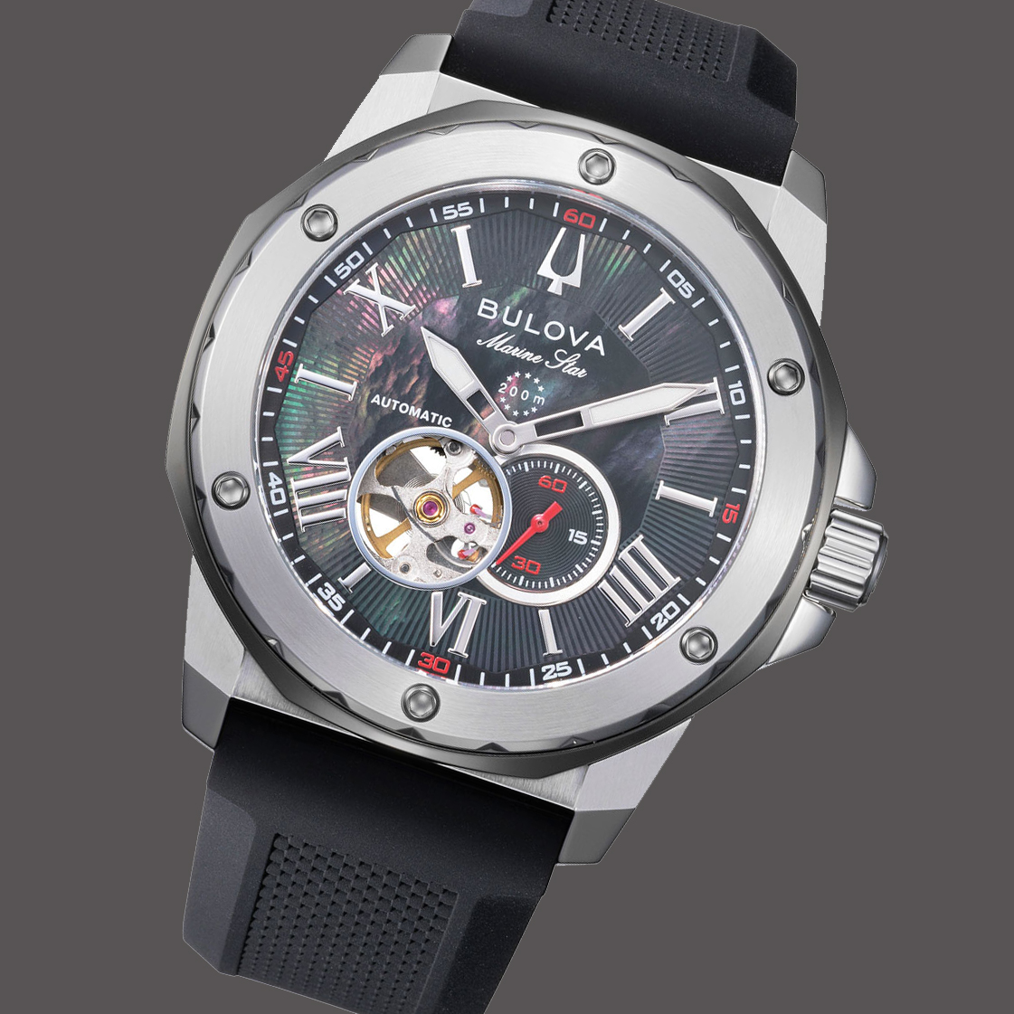 新モデルの最大の特徴は、ブラック着色したマザーオブパール(MOP)ダイアルだ。深みのある黒に染め上げられたMOPは、大人びた落ち着きをまといながら、天然素材ならではの唯一無二の表情を生み出す。ダイアルのツートーン(シルバー×ブラック)はシックな雰囲気を演出し、その中で4時位置の赤いスモールセコンドが控えめながら鮮烈なアクセントとなっている。さらに7時位置にはオープンハートを設け、機械式ムーブメントの鼓動をのぞかせることで、趣味性と遊び心を添えている。