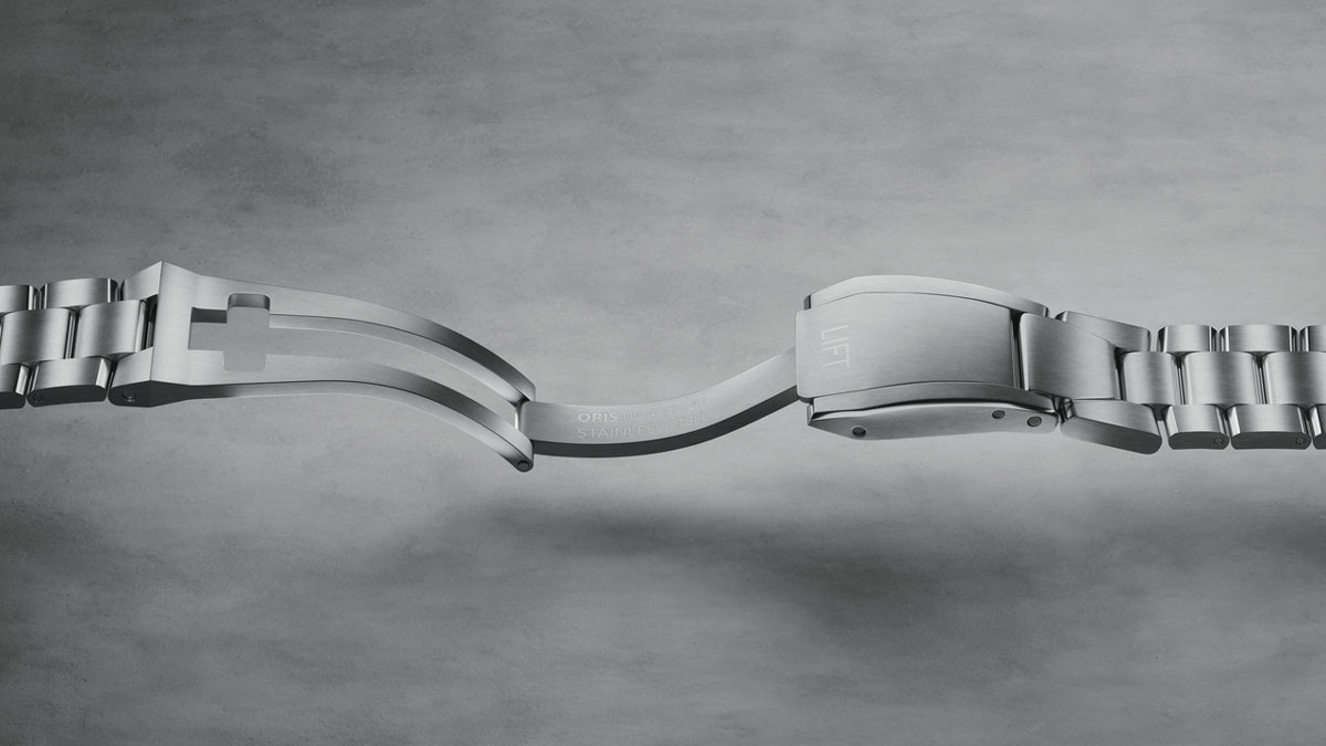 プロパイロットの象徴でもあるフルーティングベゼルは、ジェットエンジンのタービンを想起させる角度と造形で再設計されている。ダイナミックでありながら洗練された印象を与えるデザインである。また、飛行機のシートベルトのバックルに着想を得た「ORIS リフトクラスプ」も面取りを施すことで、より精緻で上質な仕上がりとなった。