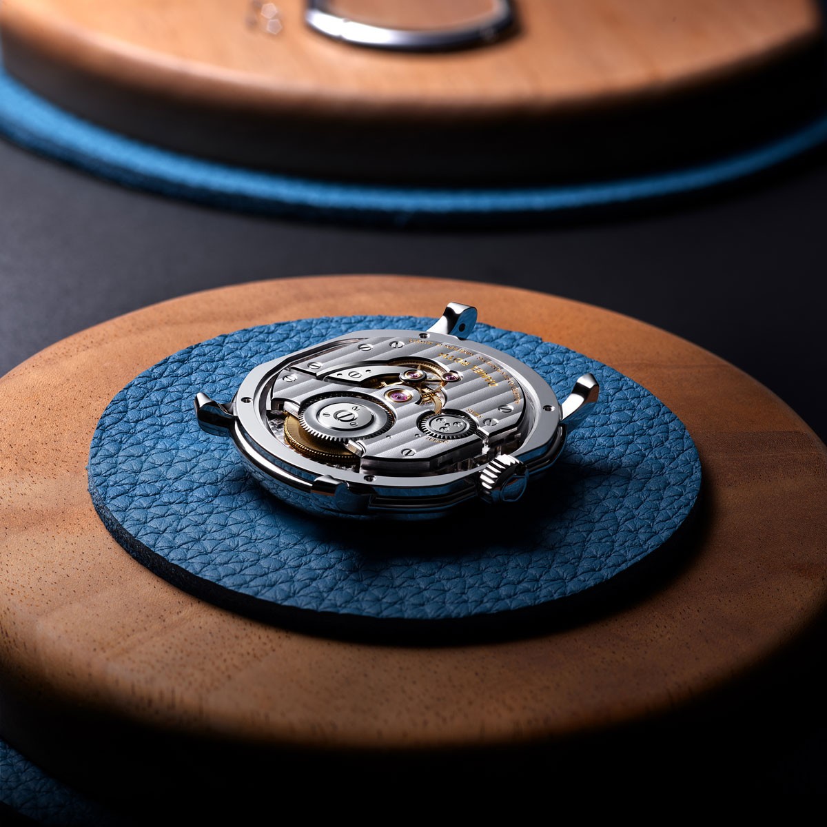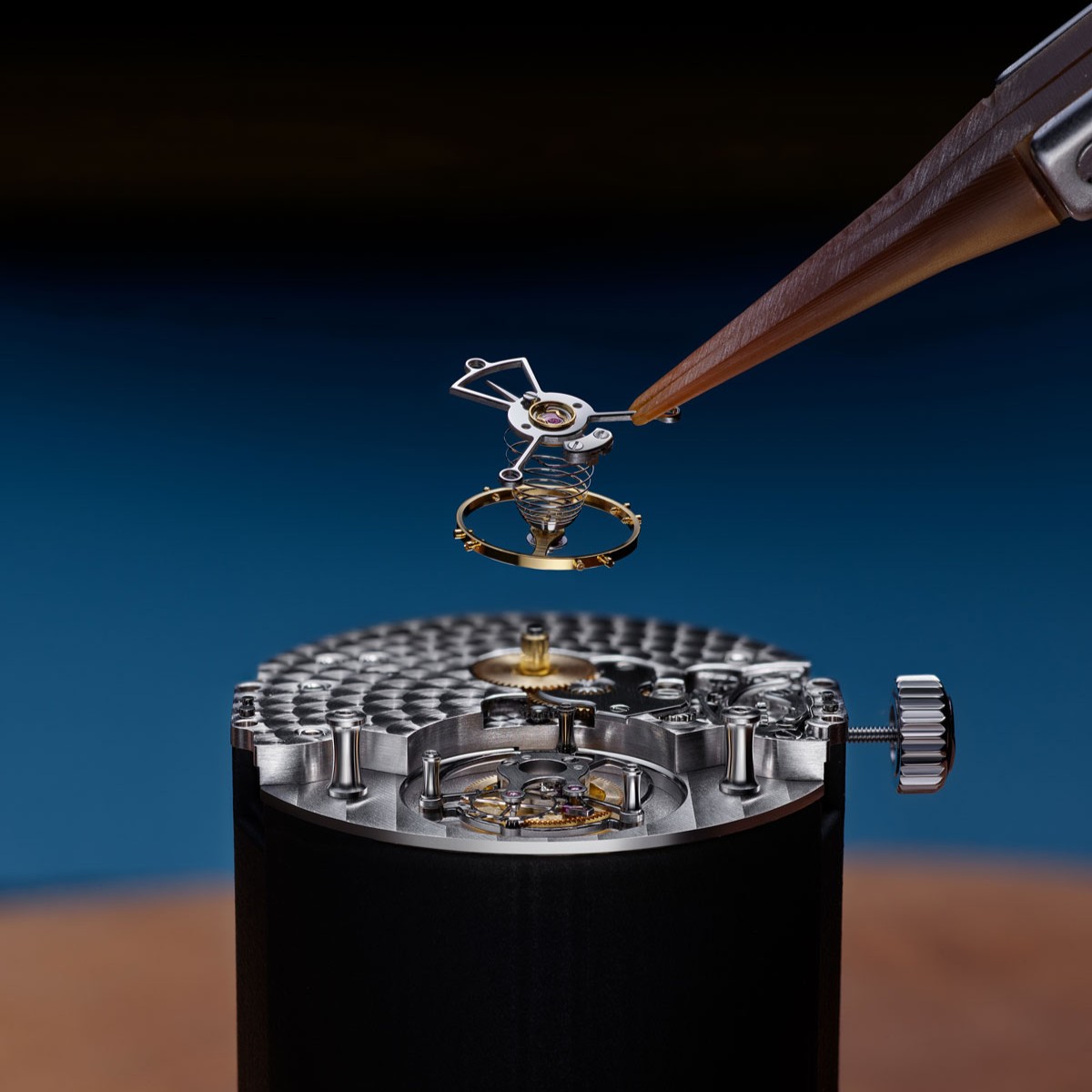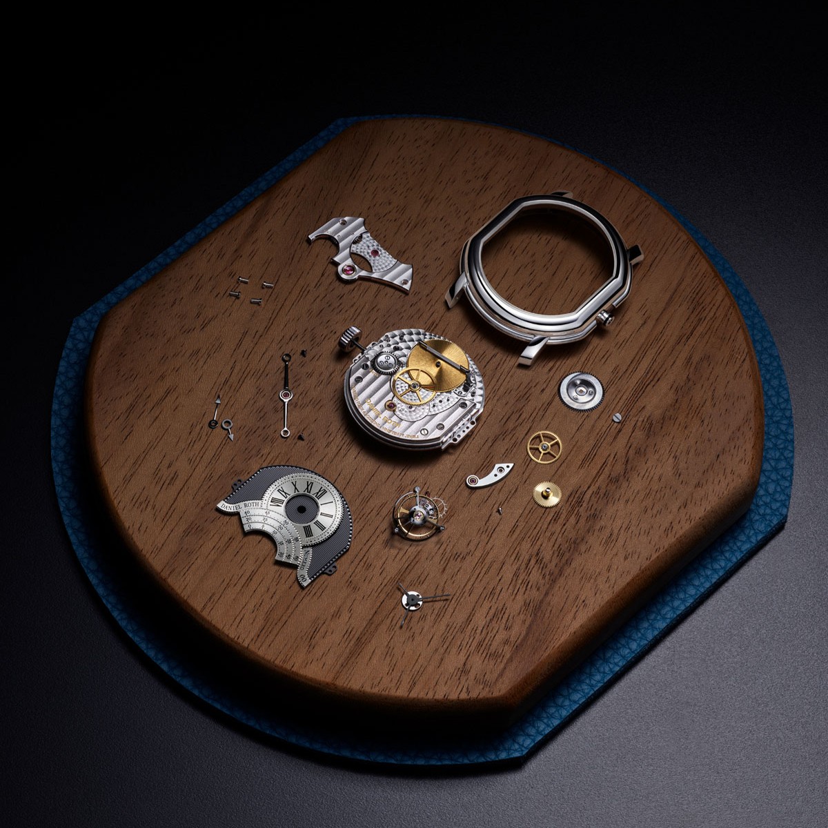 サンドブラスト加工を施したグレード5チタニウムのラウンドケースは、一見するとシンプルな造形に見える。しかしよく目を凝らすと、内側の輪郭が微かに八角形を描いており、細部へのこだわりと独創性をさりげなく主張する。さらに、ケース外周には234個のホワイトゴールドビーズを手作業でセット。まるでミニチュアの彫刻作品のような緻密なケースは、幾何学的でありながら有機的な美しさを宿す。この特徴的なケースが、薄く切り出されたブルーまたはグリーンのメテオライトダイアルを包み込む。天然の結晶構造はひとつとして同じものがなく、それぞれの時計が唯一無二の表情を持つアートピースとなっている。