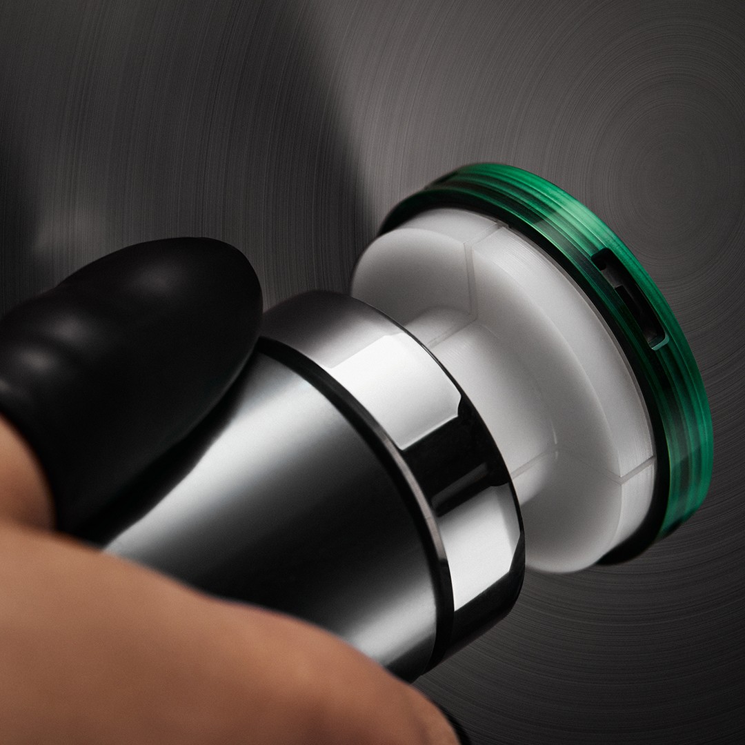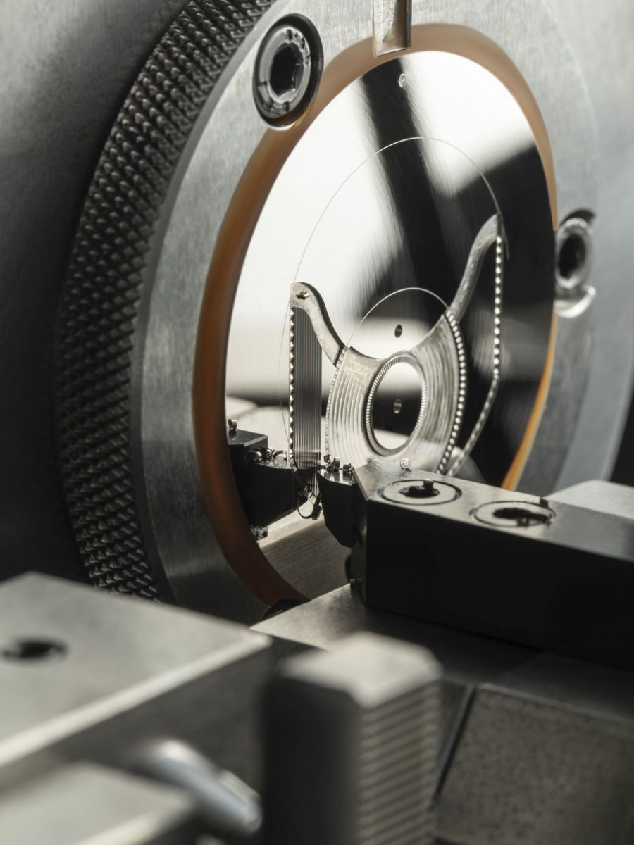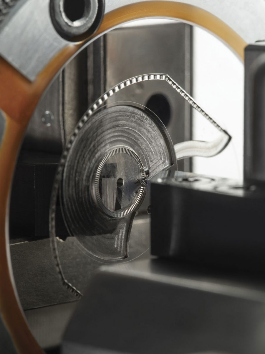 サンドブラスト加工を施したグレード5チタニウムのラウンドケースは、一見するとシンプルな造形に見える。しかしよく目を凝らすと、内側の輪郭が微かに八角形を描いており、細部へのこだわりと独創性をさりげなく主張する。さらに、ケース外周には234個のホワイトゴールドビーズを手作業でセット。まるでミニチュアの彫刻作品のような緻密なケースは、幾何学的でありながら有機的な美しさを宿す。この特徴的なケースが、薄く切り出されたブルーまたはグリーンのメテオライトダイアルを包み込む。天然の結晶構造はひとつとして同じものがなく、それぞれの時計が唯一無二の表情を持つアートピースとなっている。
