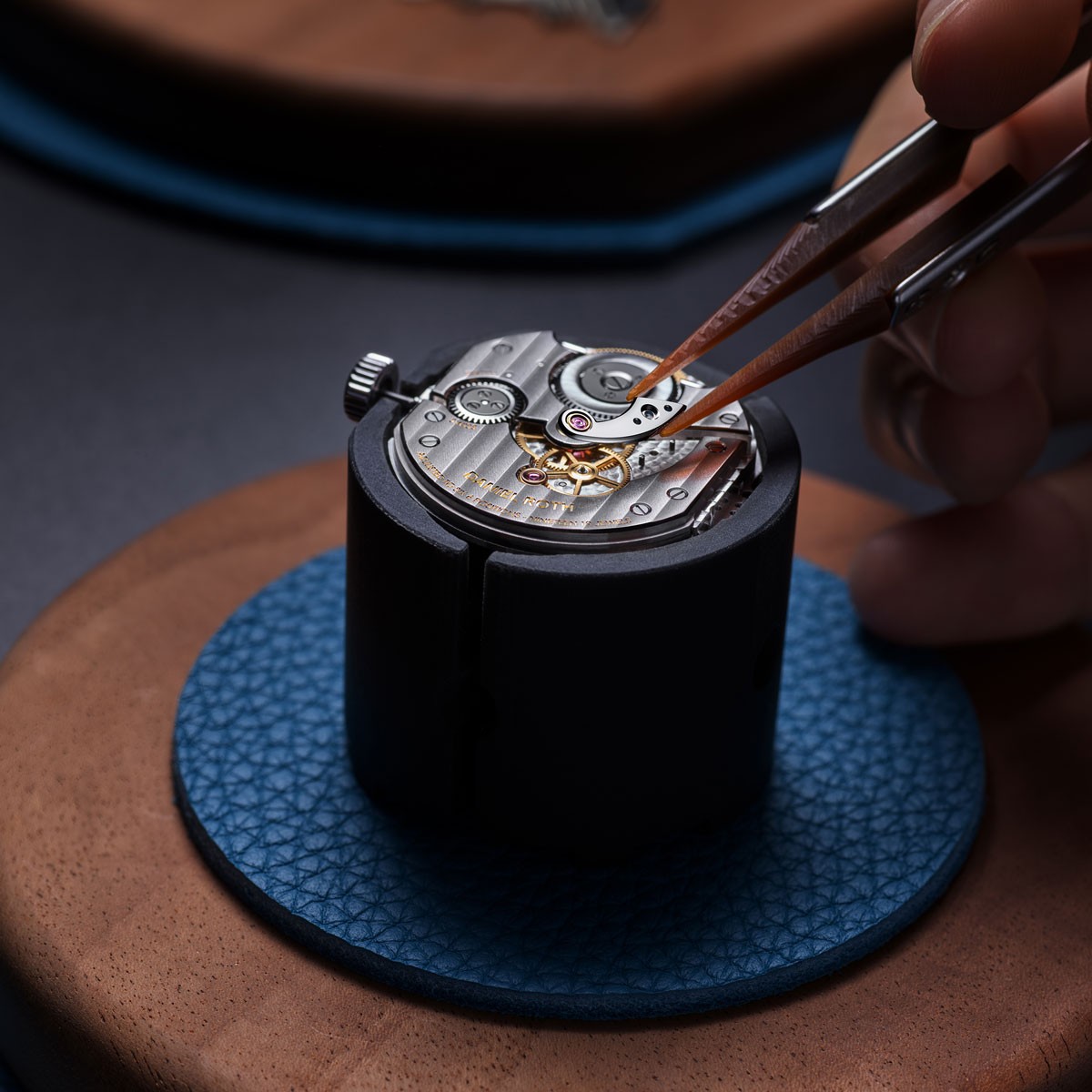 新作「エスカル」は、素材が本来持つ色彩と質感を最大限に際立たせる設計が施されている。立体的に加工された装飾石ケースは、視覚的な美しさに加え、触れた際の独特の存在感をもたらす。ストラップには初めてサフィアーノレザーを採用。ターコイズモデルにはアロヨグレー、マラカイトモデルにはレインフォレストグリーンが組み合わされ、どちらも石の色調と上品に調和する。ケース径は40mmで、2024年モデルからわずか1mmの拡大に抑え、旅の時計らしい汎用性とクラシックなプロポーションを両立した。プラチナ製ベゼルとケースバックが石の曲面より僅かに張り出す設計は、繊細な素材を実用面で支える工夫となっている。