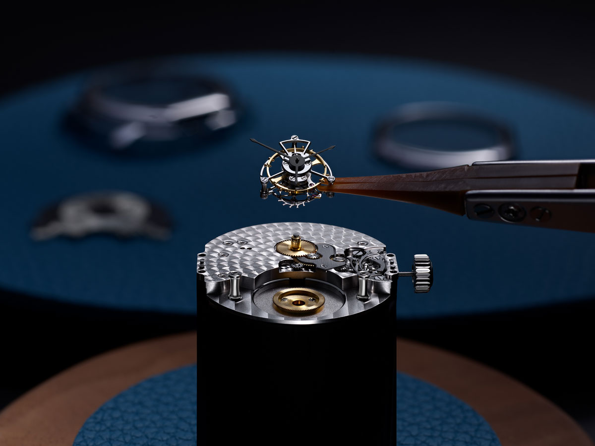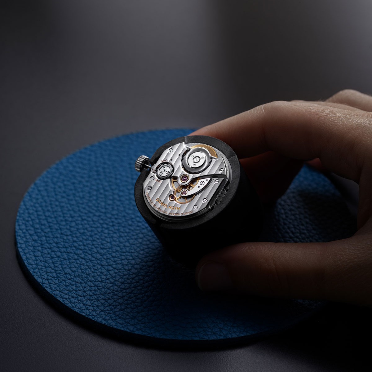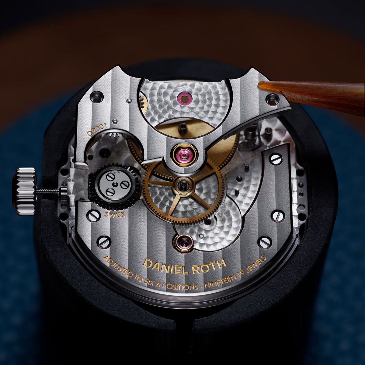「トゥールビヨン プラチナ」の心臓部は、自社開発のDR001トゥールビヨンムーブメントである。206個の部品はすべて手作業で仕上げられ、ダイアル下の部品でさえ装飾が施される。ブレゲ在籍時にロート氏が初めて製作したトゥールビヨンへのオマージュであり、独立系ウォッチメーカーとしての挑戦の象徴でもある。