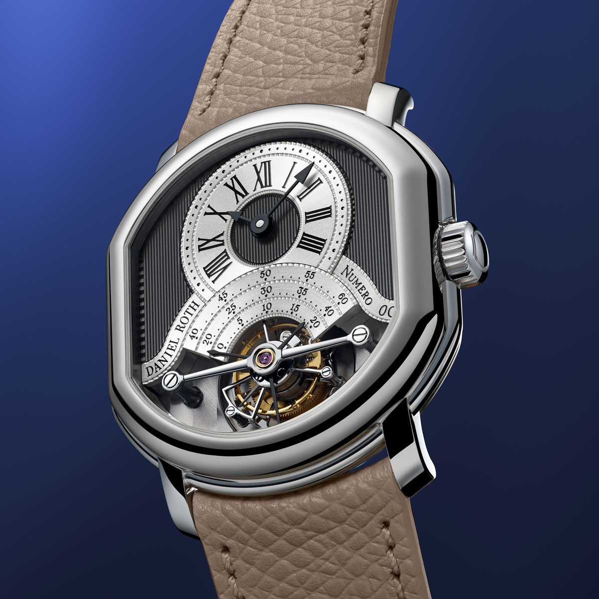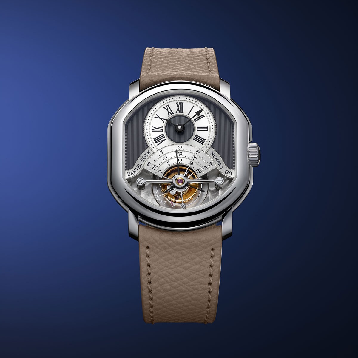 ダニエル・ロート「トゥールビヨン プラチナ」 Ref.DAAG01A1 185000スイスフラン(税抜き)/手巻き(Cal.DR001)、毎時2万1600振動、80時間パワーリザーブ。プラチナケース(シースルーバック)、レザーストラップ、サファイアクリスタル風防。縦38.6×横35.5mm、厚さ9.2mm。3気圧防水。