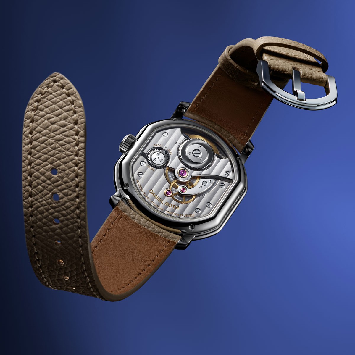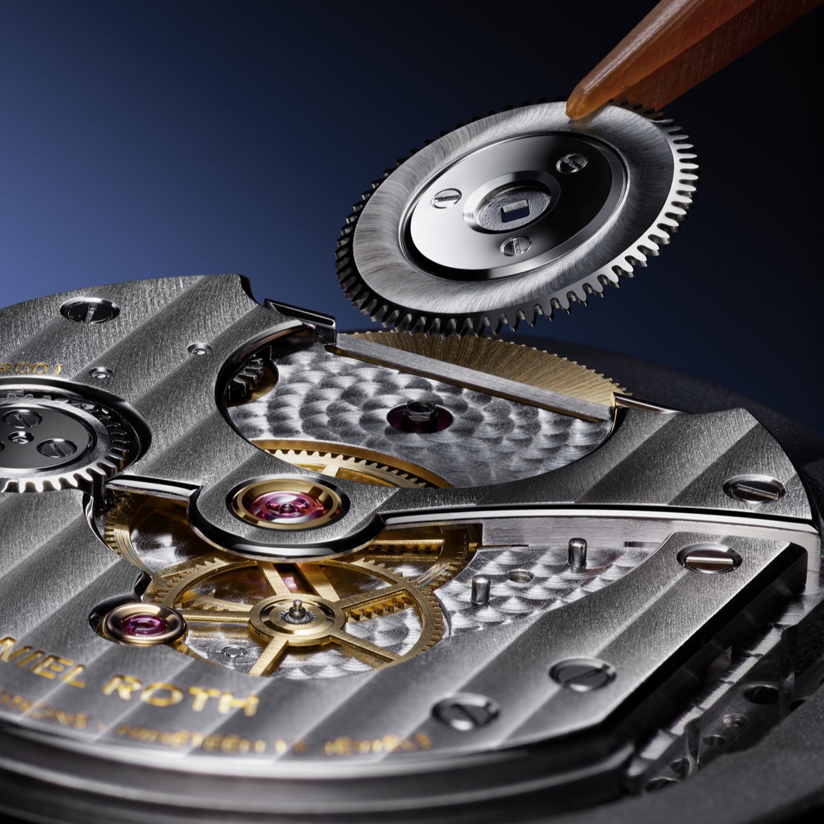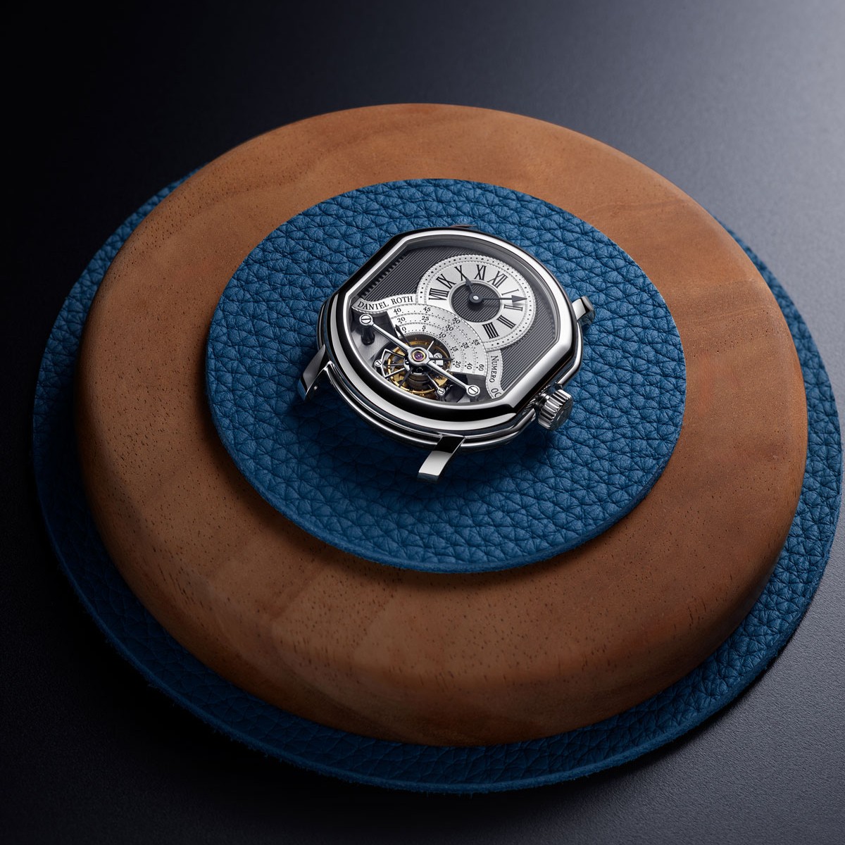 ダイアルはソリッドホワイトゴールド製でアンスラサイトの色調に仕上げられ、手動ローズエンジン旋盤による直線ギヨシェが刻まれる。時・分表示用チャプターリングはスターリングシルバー925製で、3段式秒目盛りやブランド名「DANIEL ROTH」、個別のウォッチ番号が配される。曲線的な「マスターシュ(口ひげ飾り)」も同素材で作られ、熟練職人が特注工具を用いて加工したものである。ダイアルはすべて「ラ・ファブリク・デュ・タン ルイ・ヴィトン」で自社生産され、完成までには1枚あたり最大3日を要する。