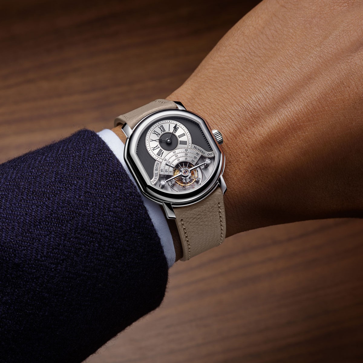 「トゥールビヨン プラチナ」は、ブランドの最初の黄金時代に限られたプラチナの使用を再び導入するモデルであり、重厚感と希少性によりコレクターに愛される貴金属の復活を告げる。プラチナは加工が非常に難しく、ケース製作には18Kゴールド製ケースの最大3倍の時間を要する。マチュー・エジは「プラチナはウォッチメーカーに畏敬と愛着を抱かせる特別な素材である」と語る。「トゥールビヨン プラチナ」は、1988年のC187デザインを忠実に踏襲し、ブランドのシグネチャーであるダブルエリプスケースを採用。四角形と円形の両要素を組み合わせたこのケースデザインは、大型トゥールビヨンに理想的であり、時の試練に耐え、現代においてもアイコニックなケースデザインとして認められている。ラグは中央に手作業で取り付けられる構造を保ちながらも、下向きアーチに再設計され、手首への装着感を改善している。