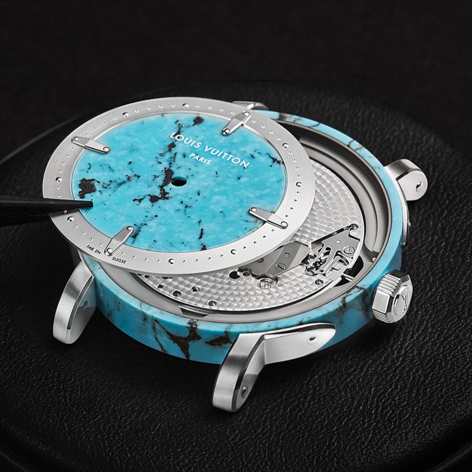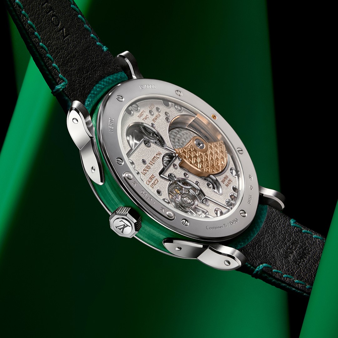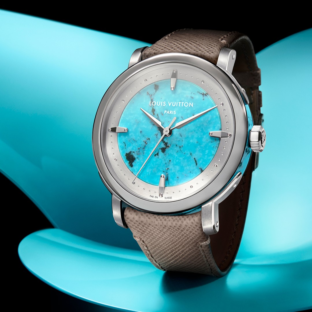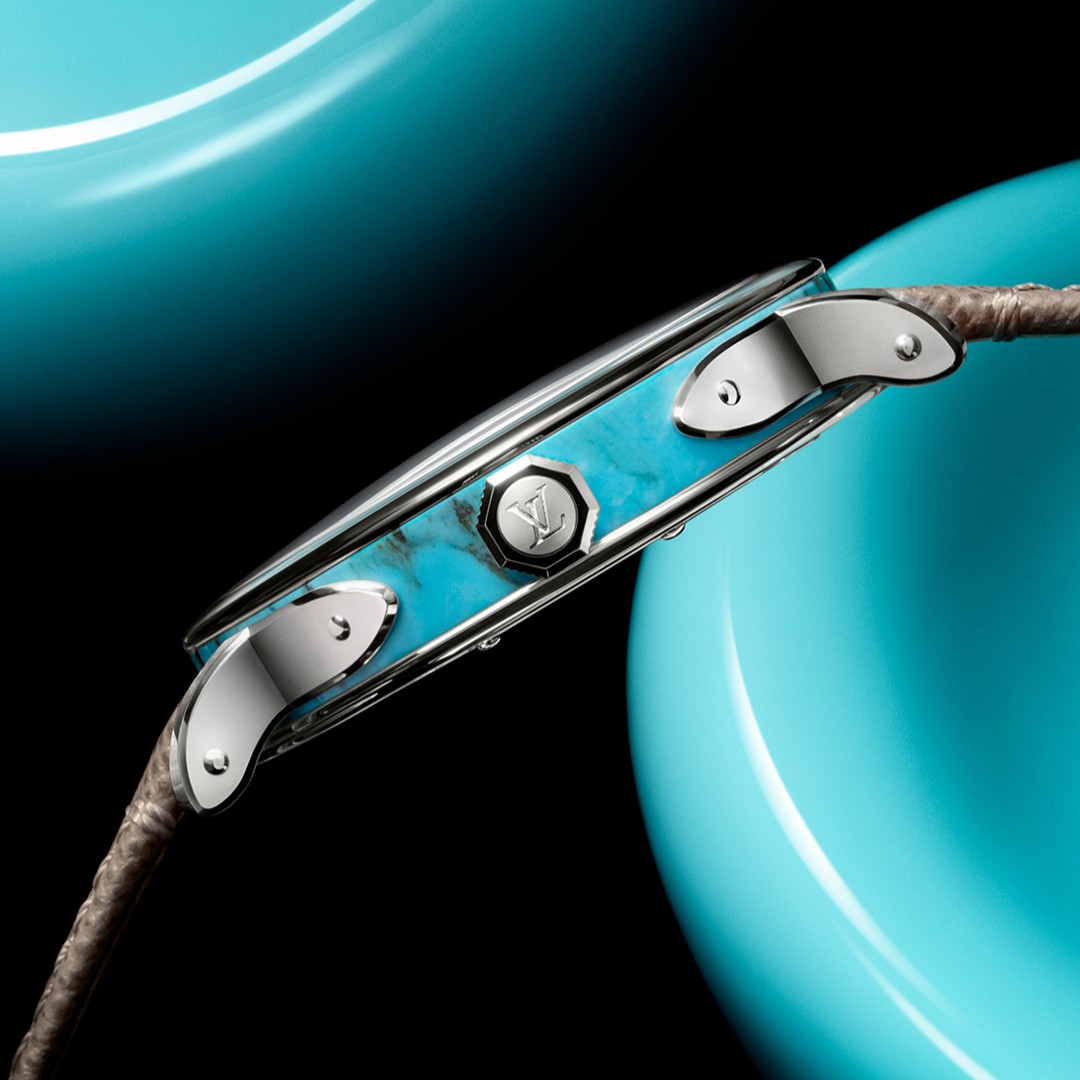 ルイ・ヴィトン「エスカル オトマティック プラチナ ターコイズ」 Ref.W3PTB1 987万8000円/自動巻き(Cal.LFT023)、毎時2万8800振動、50時間パワーリザーブ。ターコイズケース(シースルーバック)、レザーストラップ、サファイアクリスタル風防(反射防止加工)。直径40mm、厚さ8.97mm。3気圧防水。世界限定30本。
