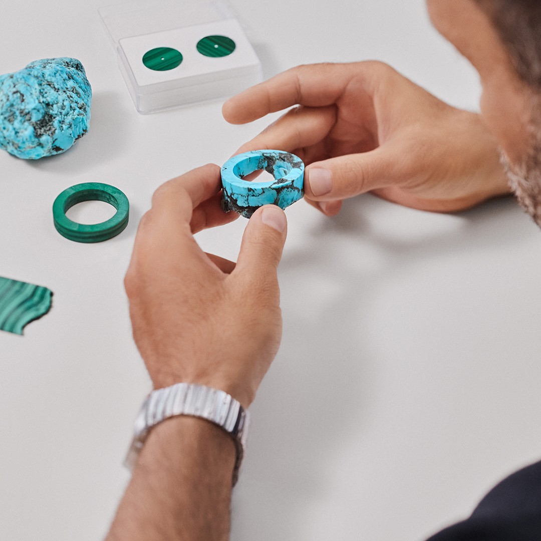 「エスカル」は旅と発見のロマンを象徴するデザインが特徴だ。これに自然界の宝石であるターコイズとマラカイトを組み合わせることで、その物語はさらに豊かになる。ターコイズの濃い筋目は大河の流れを思わせ、マラカイトの縞模様は地層のような奥行きを生む。いずれも古来より珍重されてきた素材であり、原石の段階から熟練職人がその性質を見極め、厳密な基準で選別している。青の濃淡や縞模様の精度までこだわる選定は、まさに一本の時計を仕上げるまでの“発見の旅”でもある。