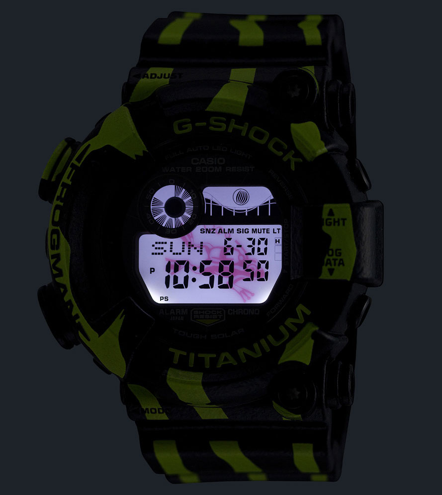 「GW-8200TPF-1JR」は、フロッグマンらしいタフさに強烈な個性を掛け合わせた一本である。ミスジヤドクガエルを思わせる蛍光グリーンの縦縞と、スプレー塗装による独特の皮膚感が強い存在感を放つ。環境配慮素材の採用や特別仕様の裏蓋など細部の作り込みも秀逸で、コンセプトモデルとして高い完成度を備えている。腕元で確実に主張するモデルである。