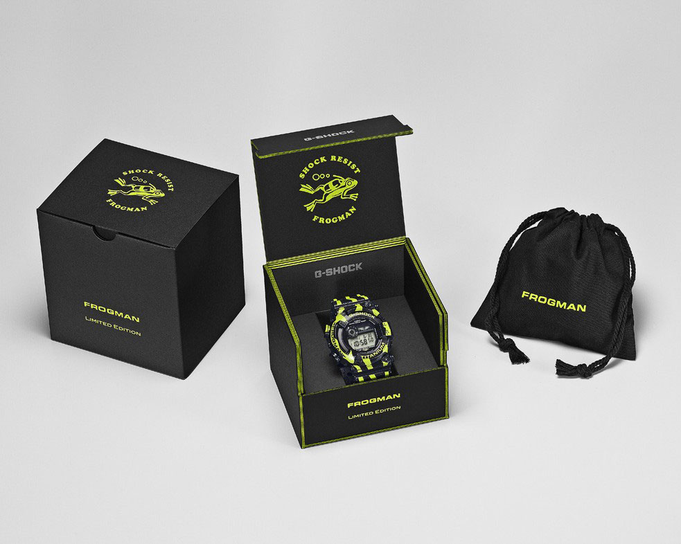 バンドとベゼルにはスプレー塗装を施し、ミスジヤドクガエルの独特の皮膚の質感を再現している。さらに、裏蓋のフロッグマンキャラクターも特別仕様となり、蛍光グリーンの縞模様をまとったスペシャルデザインが刻まれている。本作では、ベゼルやバンドの主要樹脂パーツに生物由来の「バイオマスプラスチック」を採用している。環境負荷の低減に寄与しつつ、G-SHOCKらしい独自のデザイン性も確保した素材選択である。