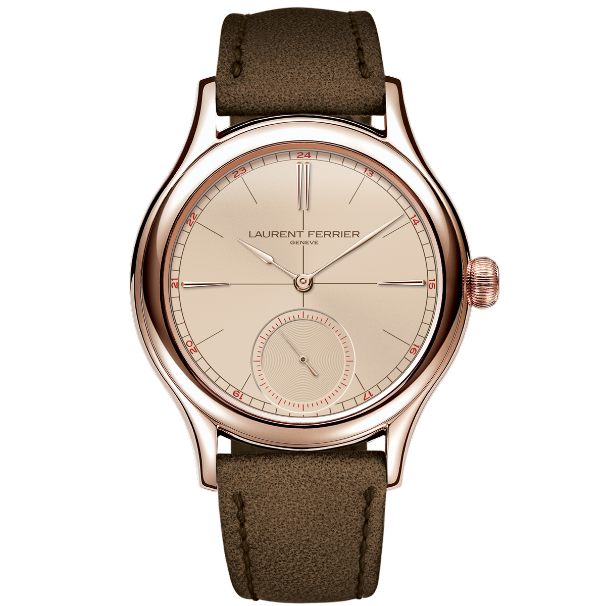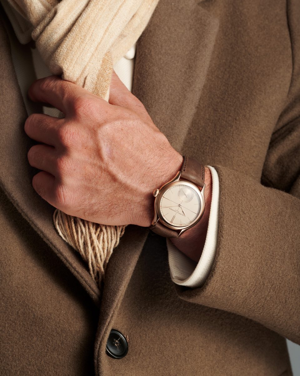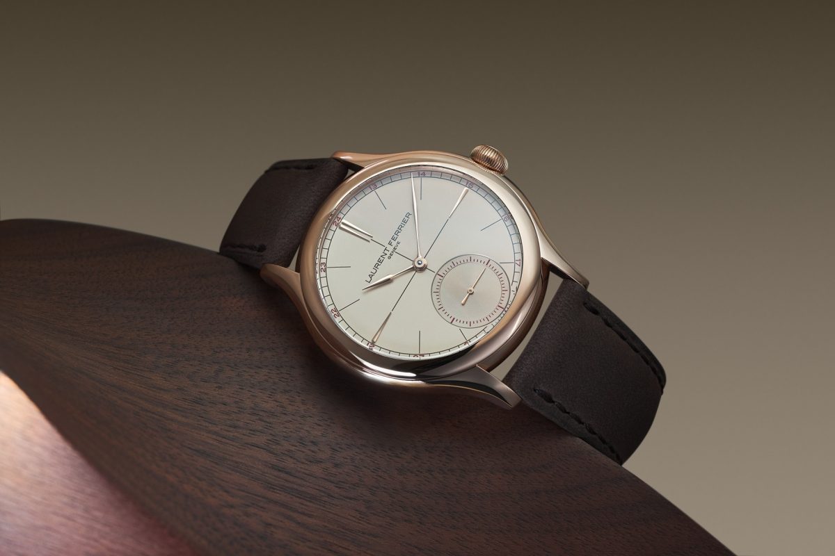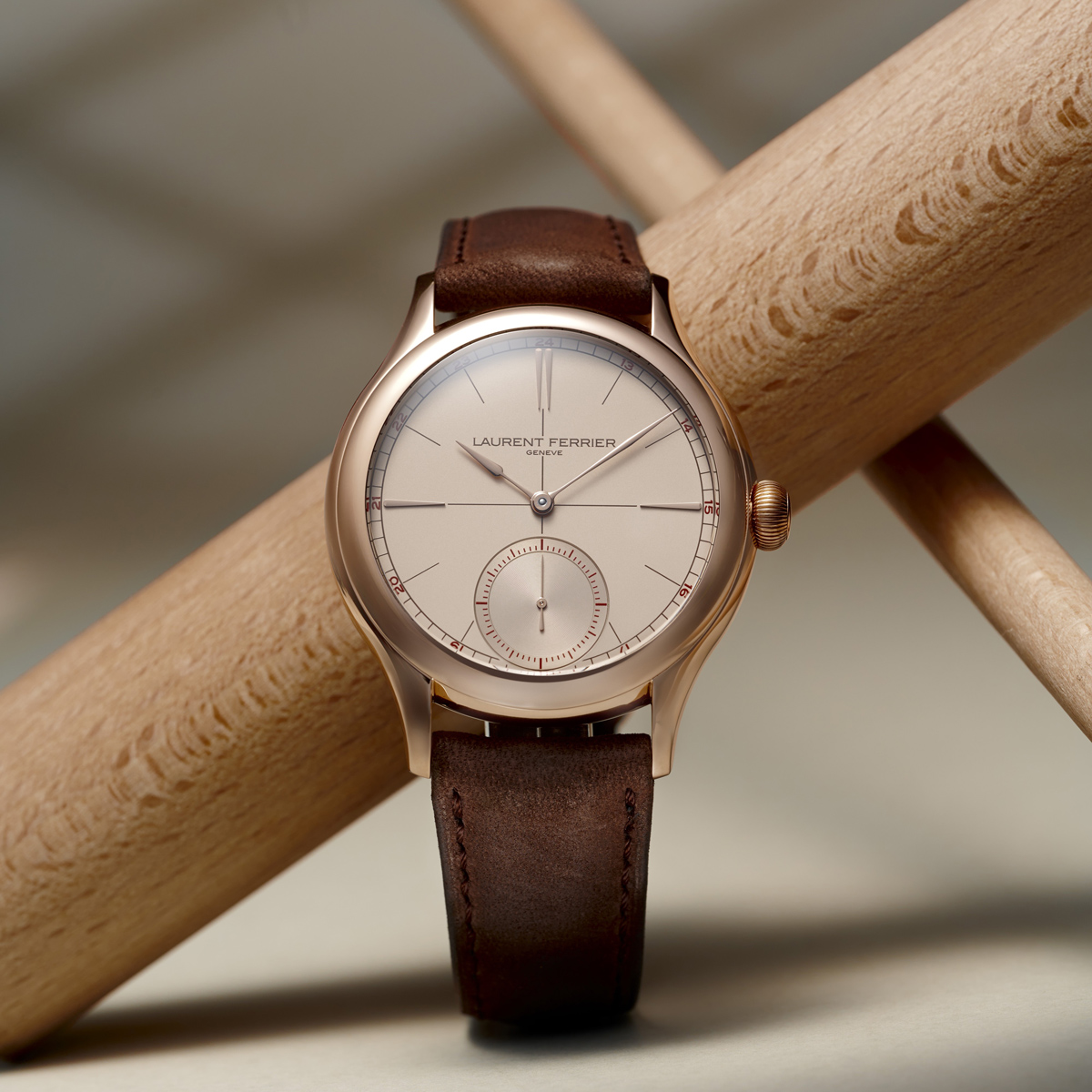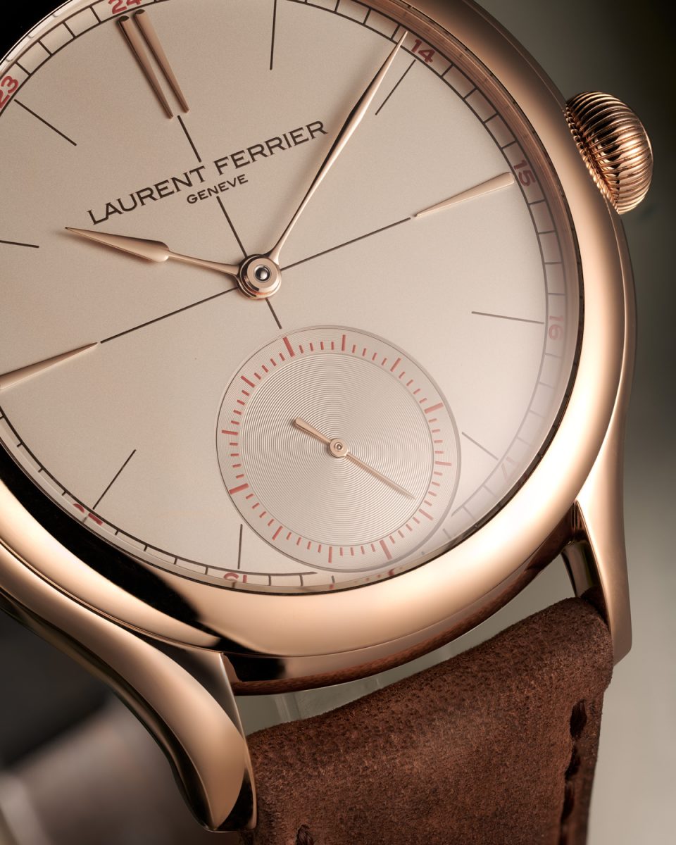 新たに取り入れられたベージュの文字盤は、懐かしさと現代性を同時に湛える絶妙な色調である。ブラウンのレールウェイトラック、センタークロス、アワーマーカーが落ち着いた雰囲気をつくり出し、6時位置スモールセコンドに配されたレッドの数字が視認性を引き締めるアクセントとして機能する。オパライン仕上げの文字盤の上を、18Kゴールド製「アセガイ」型針が静謐な優雅さとともに滑らかに進む姿は、ローラン・フェリエならではの純粋な美意識を映し出している。