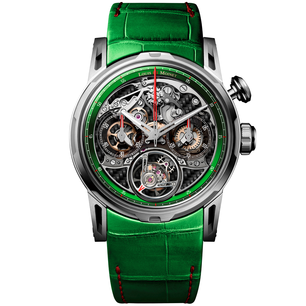 ルイ・モネ「インパルション チタニウム グリーン」 Ref.LM-114.20.DB 2860万円/手巻き(Cal.LM114)、毎時2万8800振動、約96時間パワーリザーブ。グレード5チタンケース(シースルーバック)、レザーストラップ、サファイアクリスタル風防。直径42.5mm、厚さ14.75mm。3気圧防水。世界限定12本。