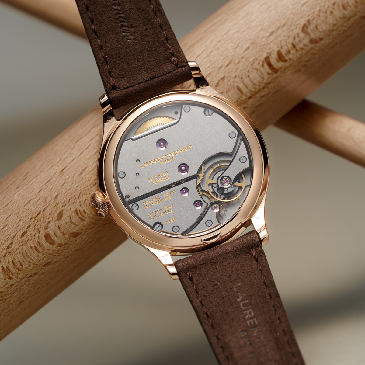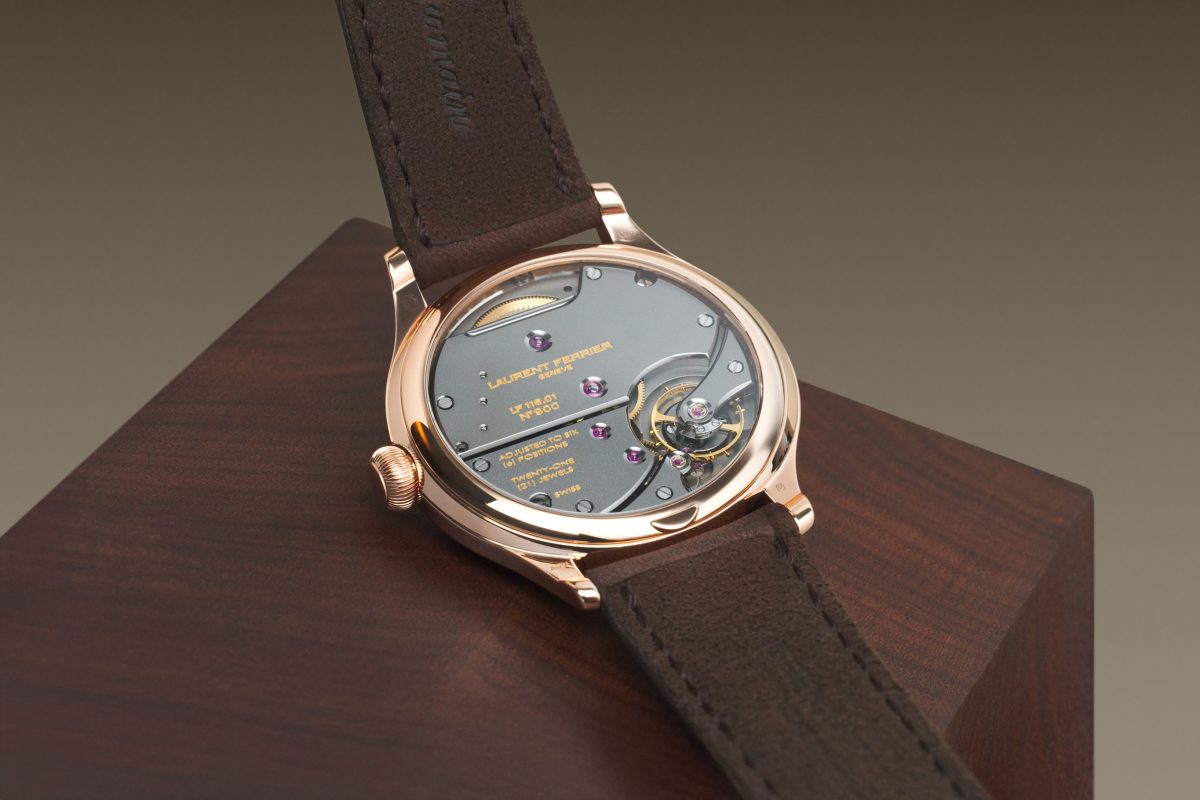 本作で見逃せないのが、ブランドのシグネチャーであるボール型リューズである。巻き上げという日常的な所作を、単なる機械的動作ではなく、所有者だけが味わうささやかな喜びへと昇華するために考案された造形である。触れるたびに確かな存在感を伝えるフォルムは、ローラン・フェリエの美学を象徴するディテールのひとつである。