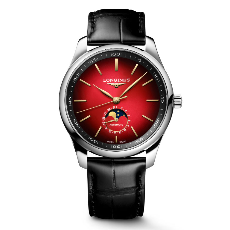 まず「ロンジン マスターコレクション イヤー・オブ・ザ・ホース」で目を奪われるのは、直径42mmという存在感のあるステンレススチールケースに収められた、サンレイブラッシュ仕上げの鮮烈なレッドダイアルである。外周から中央に向かって徐々に明度を増していく見事なグラデーションは、水平線から昇る日の出を想起させる劇的な表情を描き出し、新たな始まりを祝う吉兆を表現。この艶やかなレッドに、ゴールドカラーの針と立体的なアプライドインデックスを組み合わせることで、リッチかつ洗練された表情を作り上げた。さらに本作の特別感を象徴するのが、ゴールドのブランドロゴと対をなすように6時位置へ配されたムーンフェイズ表示だ。日付表示に囲まれたこの機構は、深いブルーの夜空に黄金の月が浮かぶロマンチックな情景を描き出し、情熱的なレッドの世界観に静謐なアクセントを添える。全体の美しさをより一層際立たせるため、あえてフランジにブラックを配して視覚的に引き締める手法からは、伝統を重んじつつモダンな感性を忘れないロンジンの美意識を感じ取ることができる。