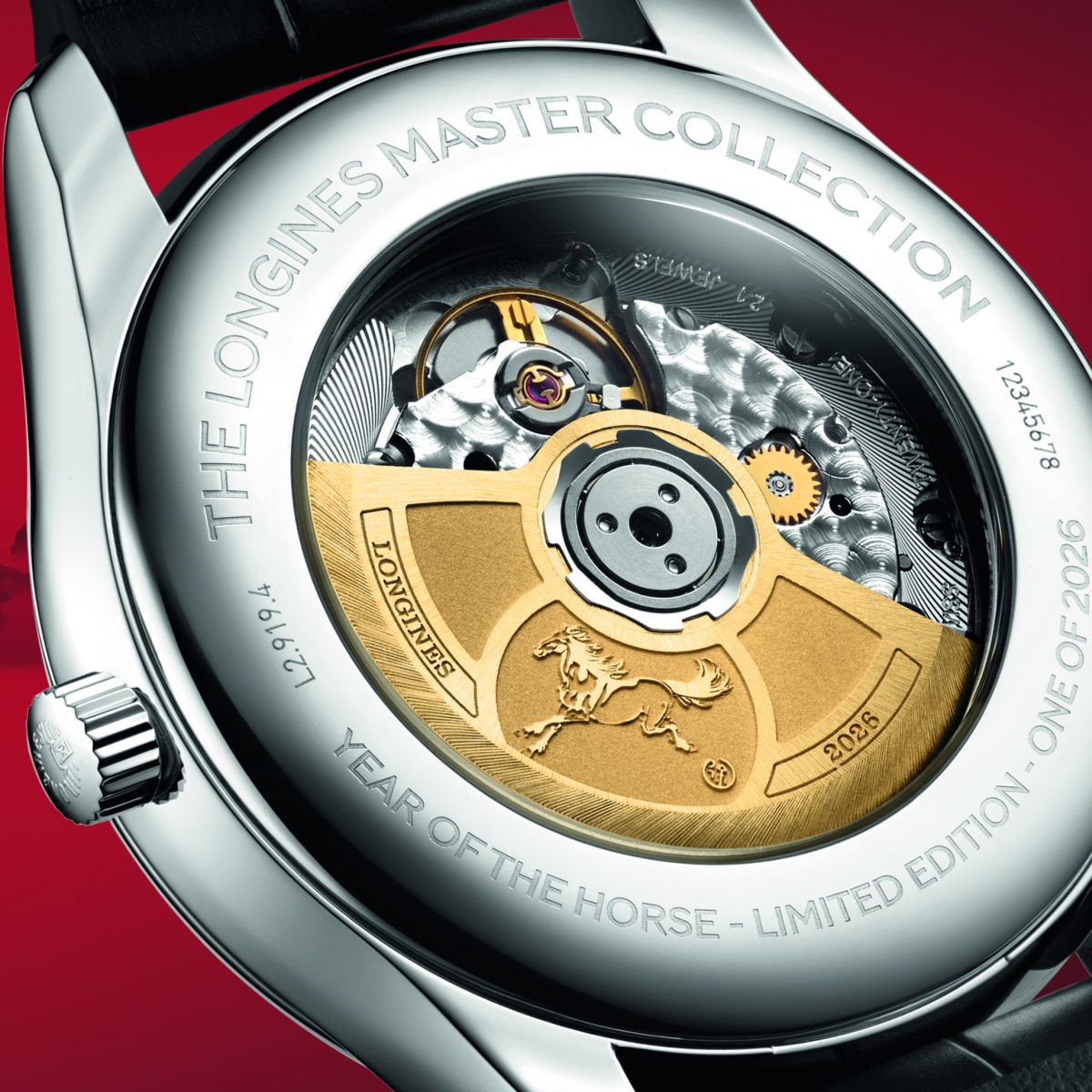 ストラップには上質なブラックレザーストラップを採用し、クラシックで洗練された佇まいを強調した。内部には、シリコン製ヒゲゼンマイを備え、優れた耐磁性と高い精度を誇るロンジン専用の自動巻きムーブメント「キャリバー L899.5」を搭載。同ムーブメントにも特別仕様ならではの意匠が凝らされており、サファイアクリスタル製ケースバック越しに、ゴールドカラーのローターへ精巧に彫刻された「奔馬図」のモチーフを鑑賞可能だ。ケースバック外周には、世界限定2026本であることを示す「one of 2026」の文字も刻印される。