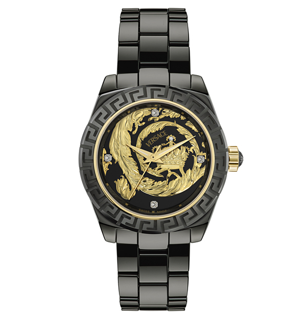 注目すべきはその気品あるフェイスデザインだ。艶やかなブラックセラミックのケースに包まれた文字盤には、4つのダイヤモンドがセッティングされている。その輝きは、まるで夜空に瞬く星々のよう。ブラックとゴールド、そしてダイヤモンドのコントラストが、ヴェルサーチェらしいラグジュアリーな世界観を腕元に演出する。
