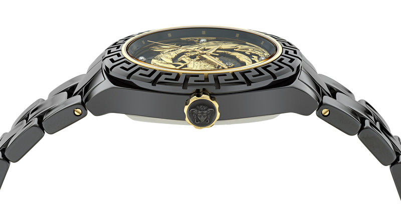 無論、ヴェルサーチェのアイデンティティとも言える象徴的なモチーフも健在だ。12時位置には、強く美しい女性の象徴である「メドゥーサ」が鎮座し、ベゼルやダイヤルのディテールには、古代ギリシャの風雷紋を模した「グレカ模様」があしらわれている。「伝統」と「情熱」。この二つのキーワードを体現するこれらの意匠は、一目でそれと分かる強烈な個性を放っている。