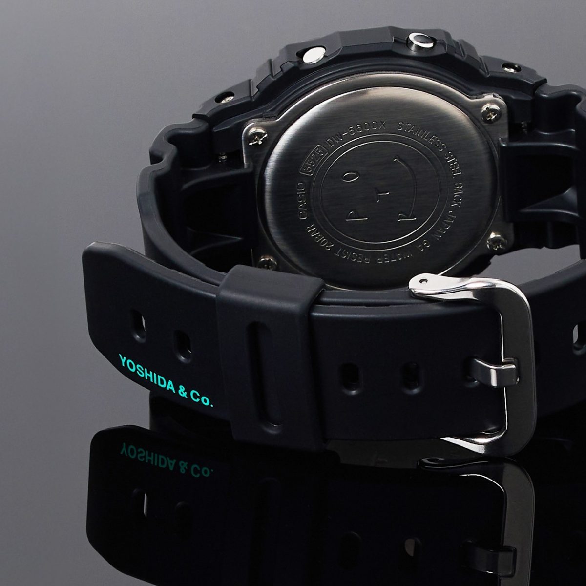 コラボレーションモデルならではのギミックも満載だ。フェイスのデザインはシンプルでありつつ、バンド部分には「POTR」と「YOSHIDA & Co.」のロゴをプリント。主張しすぎない配置のため、デイリーユースでの使い勝手を高めている。また、暗所での視認性を確保するバックライトを点灯させると、液晶部分に「POTR」のロゴが浮かび上がる。さらにケースバックには、愛らしい「POTRスマイリー」を刻印。見えない部分にも遊び心を忘れない、G-SHOCKと吉田カバンらしいこだわりのディテールを複数備えている。