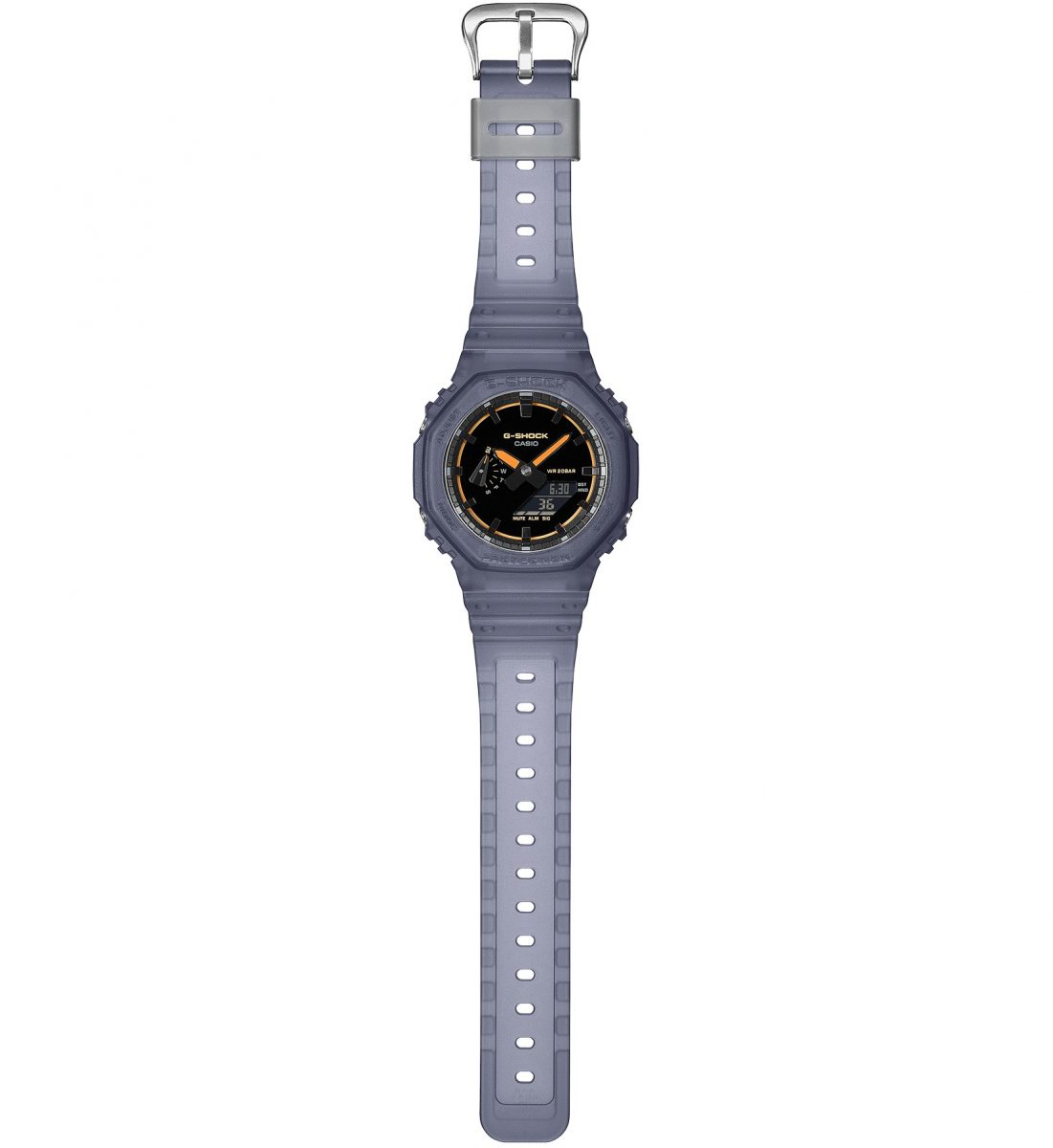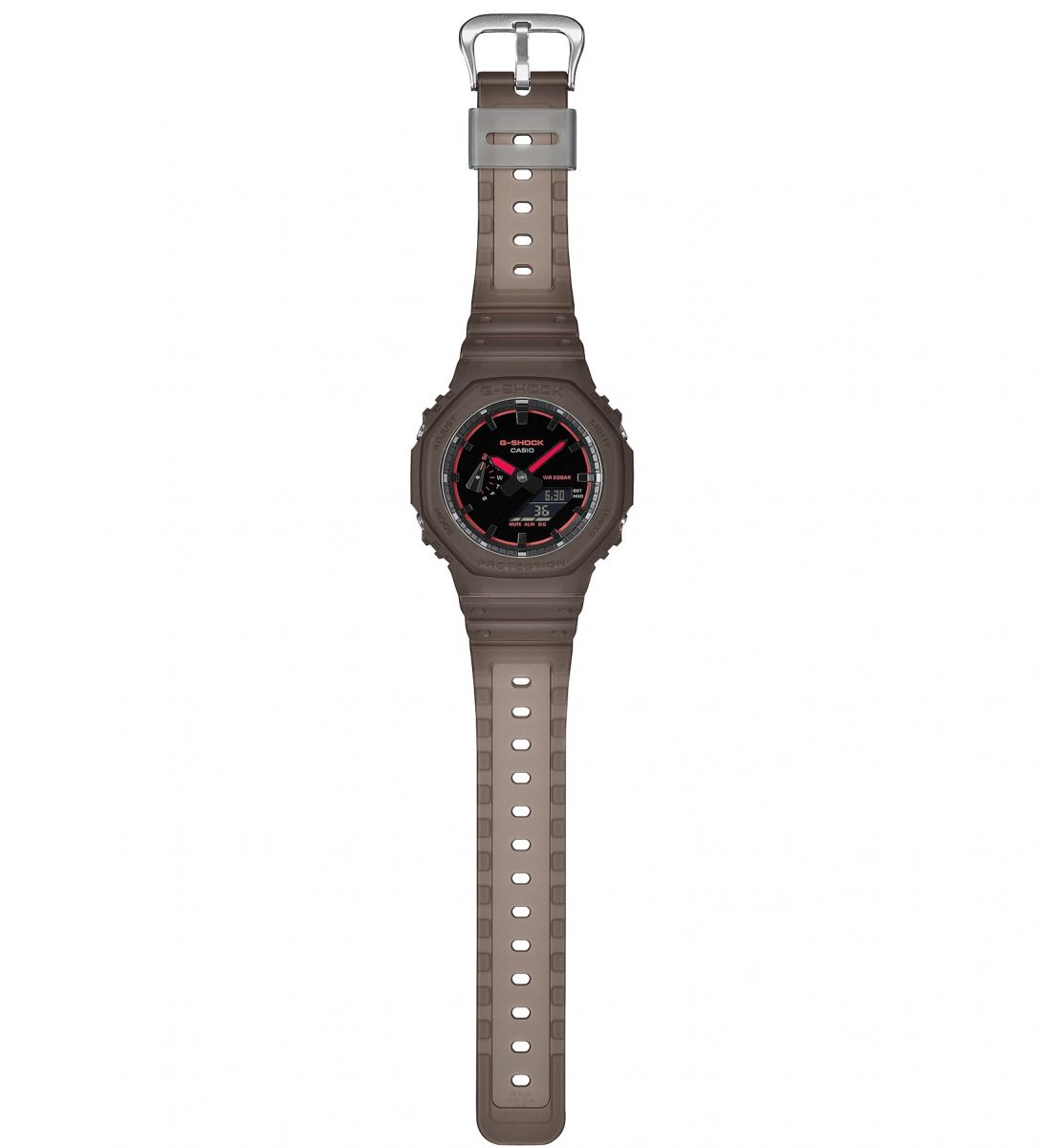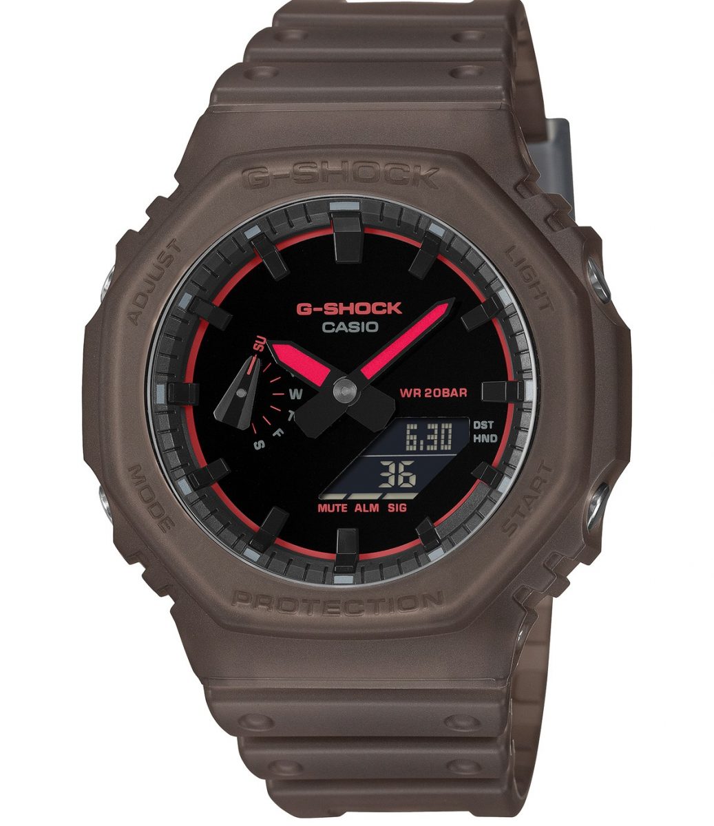 ベースとなるのは、八角形ケースで人気のGA-2100シリーズだ。GA-2100 は、G-SHOCK の原点を現代的に再構築したモデルで、八角形のオクタゴンベゼルは初代「DW-5000C」の系譜を感じさせつつ、洗練された印象を与える。表示はアナログとデジタルのコンビネーションで、視認性と機能性を両立している。ケースにはカーボンコアガード構造を採用し、高い耐衝撃性を確保しながら軽量化を実現した。また、ケース厚約11.8mm の薄型設計により装着感に優れ、日常使いしやすい点も特徴である。20 気圧防水やワールドタイム、ストップウォッチなどの基本機能を備え、実用性の高い G-SHOCK といえる。