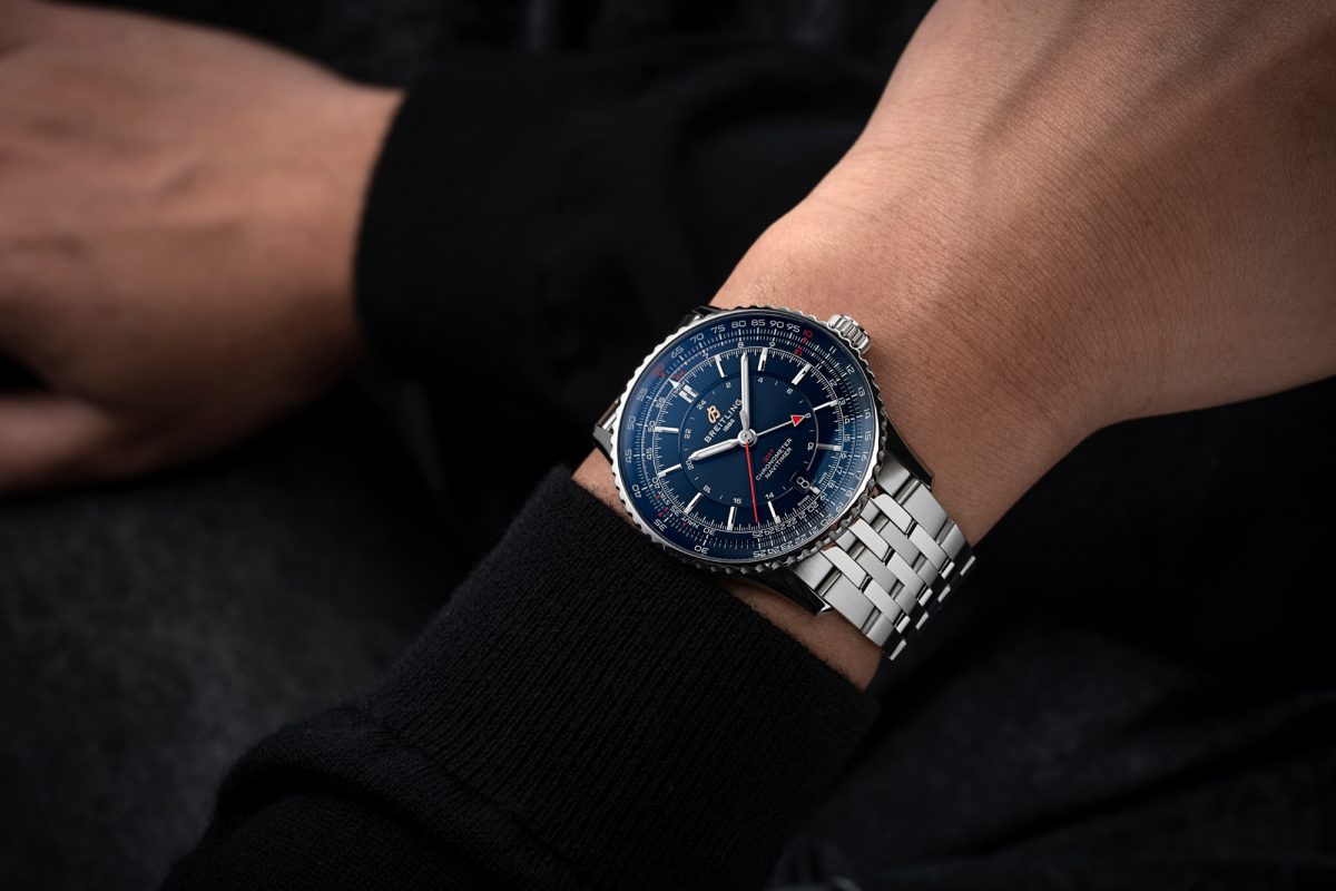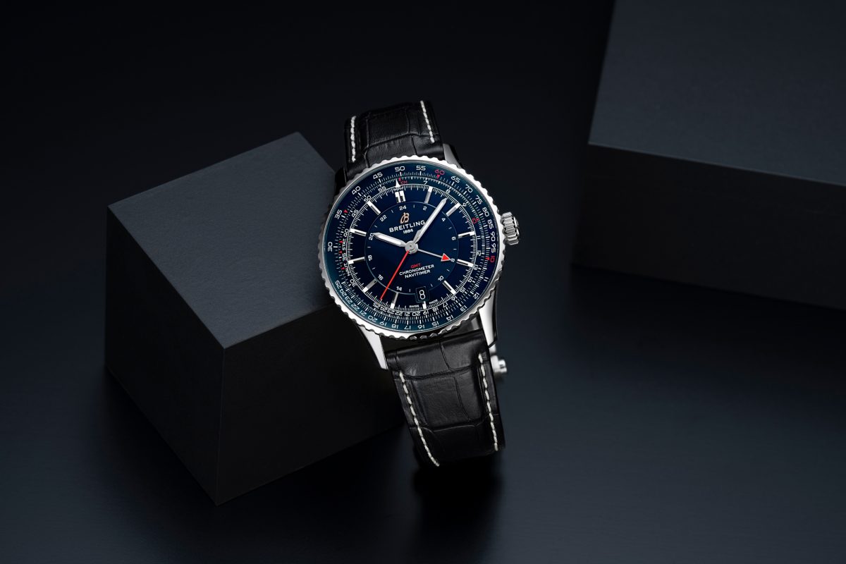 ↑「ナビタイマー オートマチック GMT 41」はセンターに24時間目盛りをレイアウト。ナビタイマー固有の緻密な計算尺の美しさを際立たせつつ、藍色によってより引き締まった印象だ Ⓒ2026 SAMURAI JAPAN