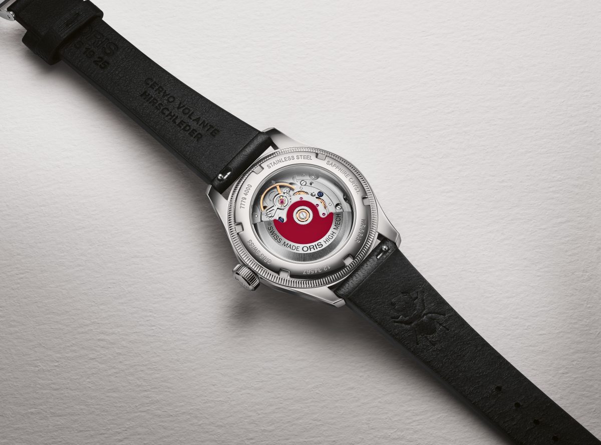 時計の内部には、信頼性に定評のある自動巻きムーブメント「キャリバー754」を搭載。シースルー仕様のケースバックからは、オリスの象徴である機械式ムーブメントの躍動を直接鑑賞することができる。風防には内面無反射コーティングを施したドーム型サファイアガラスを採用し、ヴィンテージウオッチ特有の質感を再現しながらも、現代の基準に適合する実用性を確保。また、ストラップにはサステナブルなアプローチとして、チェルボ・ボランテ社製のブラック鹿革を採用した。この革は頭数管理のために駆除された鹿の皮を再利用したものであり、オリスが活動の中心に据える「人と地球、環境への深い敬意」を体現する仕様となる。クイックチェンジシステムの搭載により、特別な工具なしでストラップ交換が可能な点も、ユーザーにとって嬉しい配慮だ。