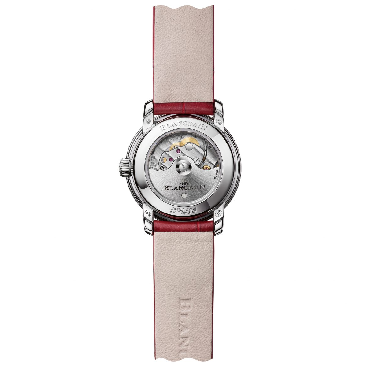 本機の心臓部に収められているのは、ブランパンの技術力の結晶である自社製自動巻きムーブメント「キャリバー615」だ。ケース厚わずか3.90mmという驚異的なスリム化を実現しながらも、シリコン製ヒゲゼンマイを採用することで、優れた耐磁性と高い精度を確保。シースルー仕様のケースバックからは、同ムーブメントの細部にまで至る精緻な仕上げと、ハートのモチーフがエングレービングされたローターの動きを鑑賞することが可能だ。38時間のパワーリザーブを備えた「キャリバー615」は、実用性と審美性の両立というメゾンの変わらぬ哲学を静かに主張している。また、ストラップには燃えるような情熱と深い愛情を体現した「シェリーレッド」のアリゲーターを採用。マザーオブパールの柔らかな色合いとダイヤモンドの純粋な輝き、そしてストラップの鮮烈な赤。この三要素が絶妙に調和し、美しい佇まいをよりいっそう高貴なものへと昇華させている。