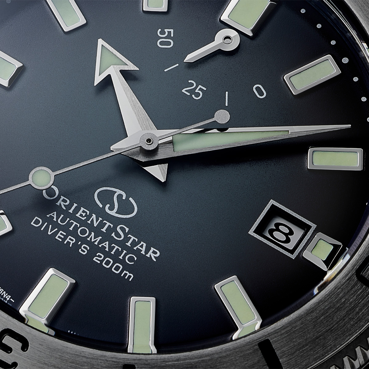 ケースには高品質なステンレススチール(SUS316L)を用いており、直径41mm、厚さ14.5mmと現代的なサイズ感に仕上げた。内部には、日差プラス25秒からマイナス15秒の精度を確保した自社製の自動巻きムーブメント「キャリバーF6N47」を搭載。ダイバーズウオッチとしては珍しいパワーリザーブ表示を備え、12時位置のインジケーターで駆動状況を一目で確認できる実用性は、「オリエントスター」ならではの配慮といえるだろう。