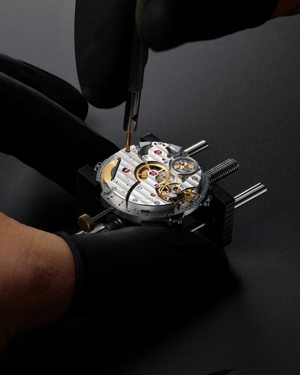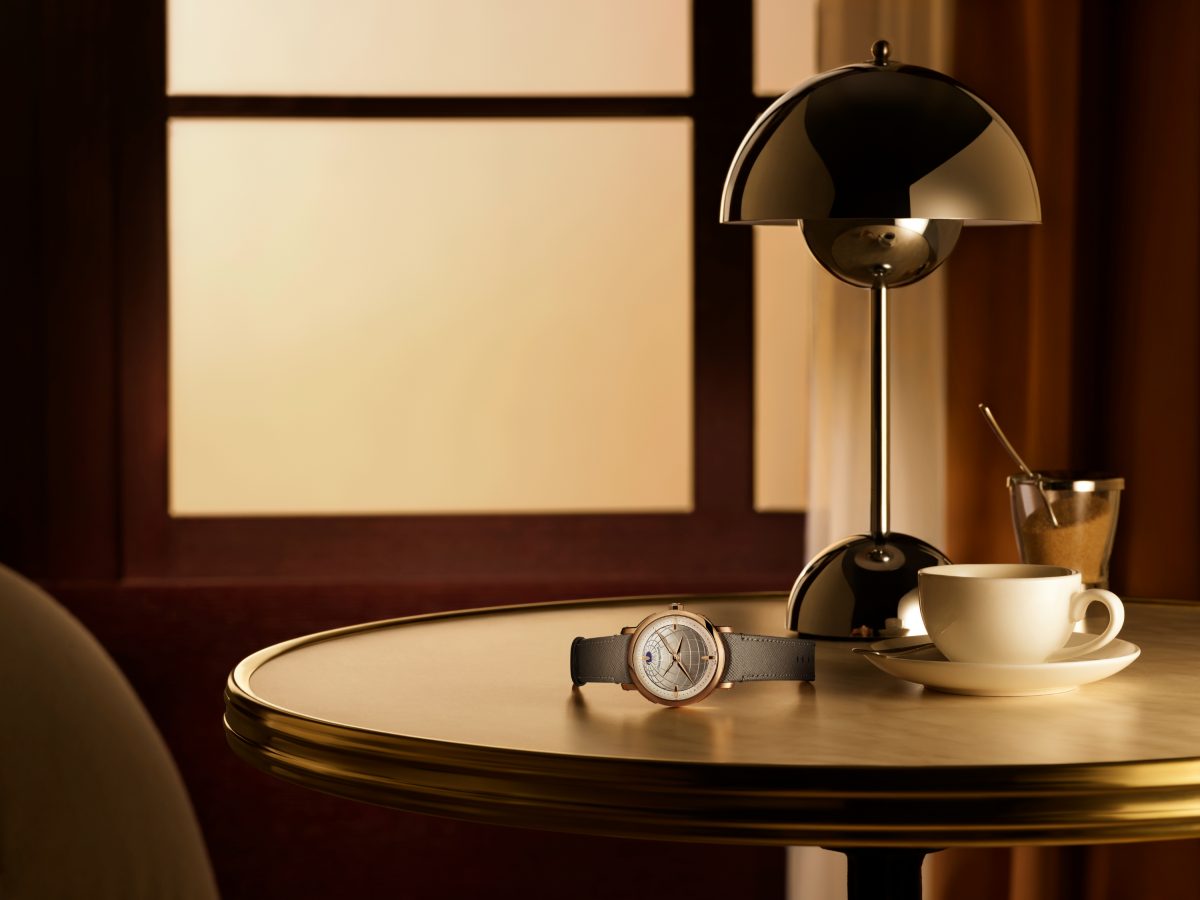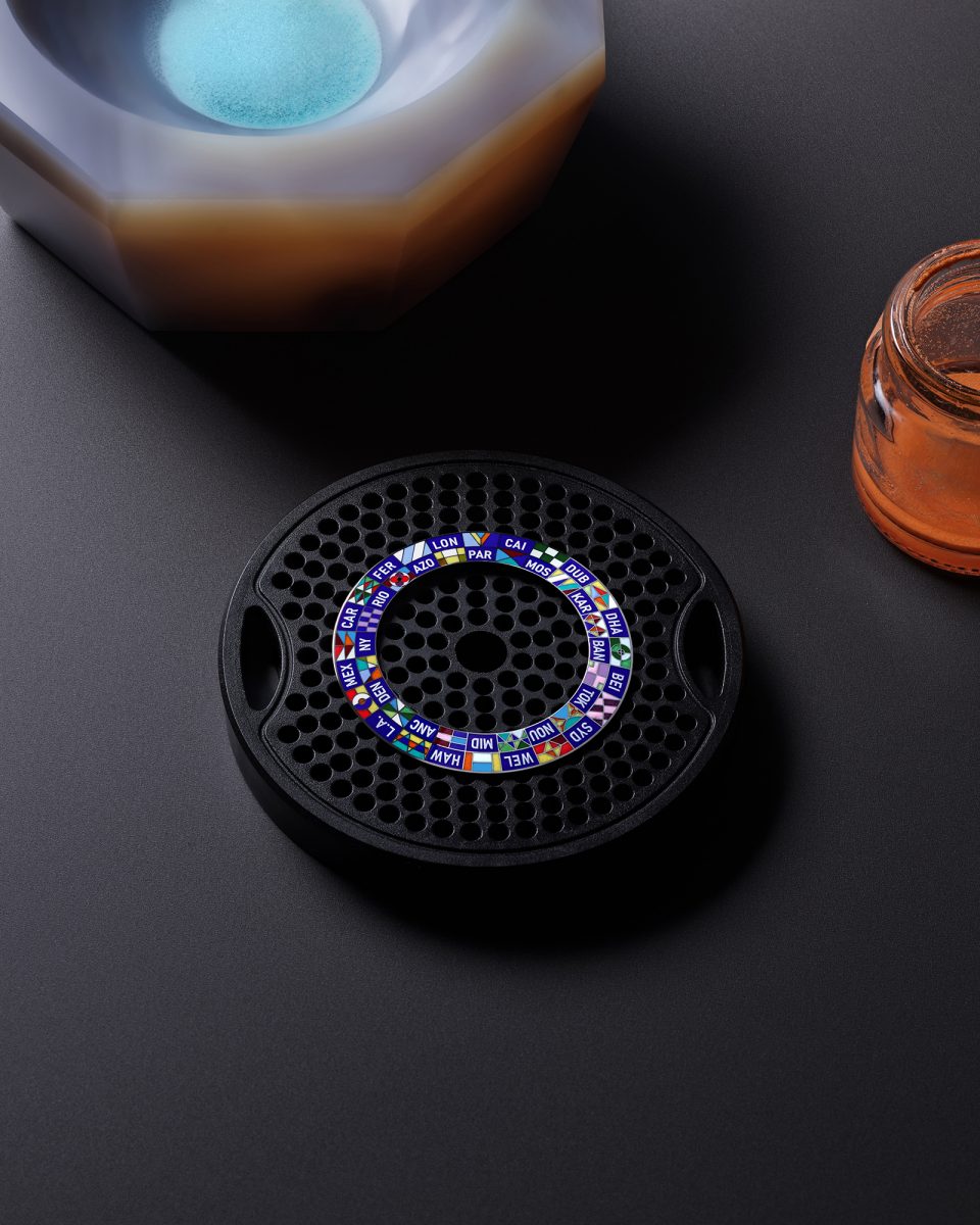 今回の新作群において、最も象徴的な一本が「エスカル ワールドタイム」だ。2014年の誕生以来、独創的な佇まいで愛好家を魅了してきたこのアイコンが、コレクション初となるプラチナケースを纏い再定義された。特筆すべきは、ダイアルに宿る手工芸の妙だ。極細の絵筆を操るミニチュアペインティングにより、世界を象徴する24のフラッグを見事に表現。35色もの色彩を1色ずつ重ね、その都度オーブンで焼き固める工程を経ており、ひとつのダイアルを仕上げるために丸一週間を要する。この芸術的なダイアルの裏側では、自社製ムーブメント「キャリバー LFT VO 12.01」が静かに、かつ正確に時を刻む。リューズひとつで都市と時刻を直感的に操作できる機能性は、複雑機構でありながら現代的な機能美を見事に体現する。