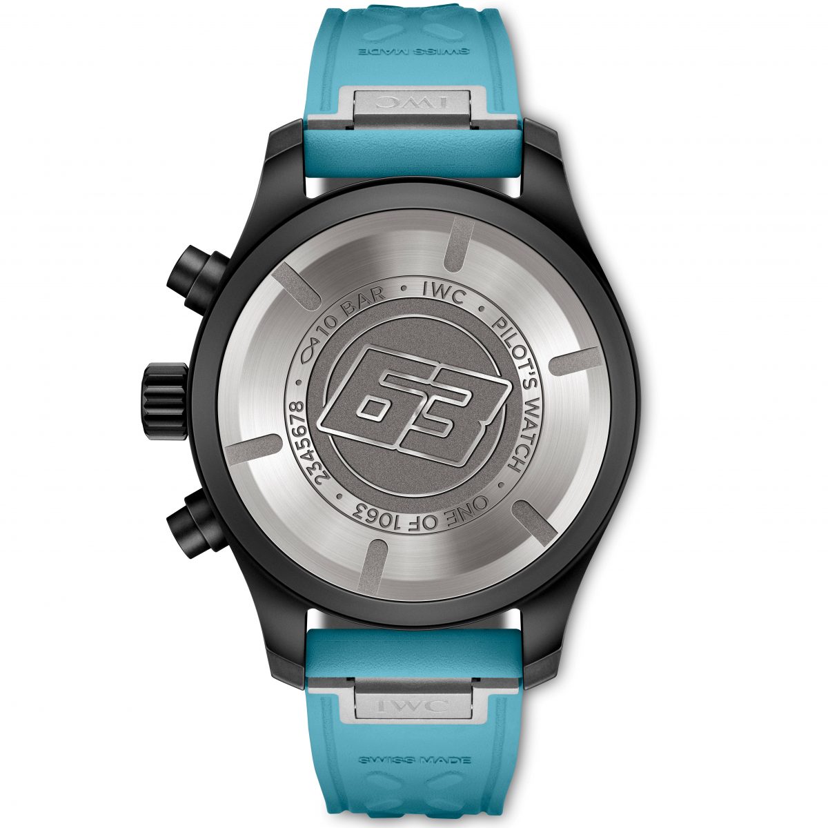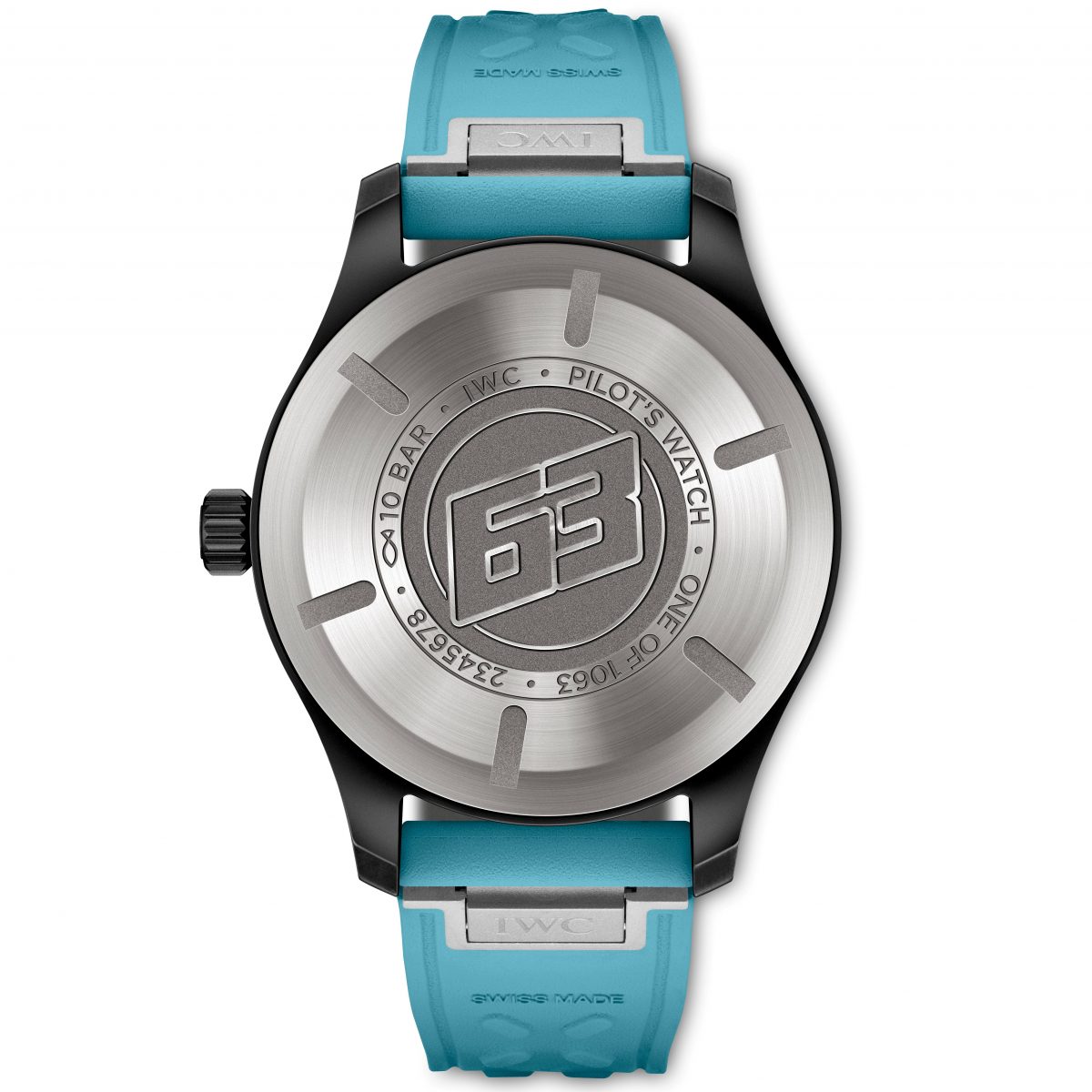 両モデルに共通する意匠として、チタン製のケースバックにはラッセルのカーナンバーである「63」を刻印。これは彼が幼少期のレーシングカート時代から守り続けてきた数字であり、非常にパーソナルなディテールとなる。また、ストラップには文字盤のディテールと呼応するブルーのラバーが組み合わされ、セラタニウム製のピンバックルを装備。EasX-CHANGEシステムの採用により、専用工具を使わずとも瞬時にストラップ交換が可能な点も、ユーザーの利便性を考慮したIWCらしい設計だ。