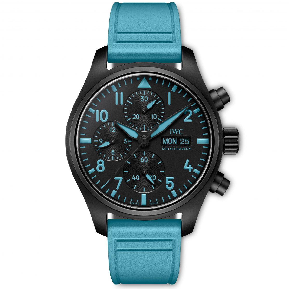 まず注目すべきは、クロノグラフ機構を備えた世界1063本限定モデル「パイロット・ウォッチ・クロノグラフ 41ジョージ・ラッセル」だ。直径41.9mmのケースには、1980年代にIWCが時計業界に先駆けて導入したブラックの酸化ジルコニウム・セラミックを採用。同素材はステンレススチールよりも遥かに軽量でありながら、極めて高い硬度と耐傷性を誇り、過酷な環境下での使用を想定したパイロットウオッチに最適な選択となる。さらに、リューズとプッシュボタンにはIWC独自の先進素材「セラタニウム」が用いられた。チタンの軽さと構造的な強靭さ、そしてセラミックの硬さを併せ持つこのハイテク素材は、オールブラックの精悍な外観をより一層引き立てる役割を担う。