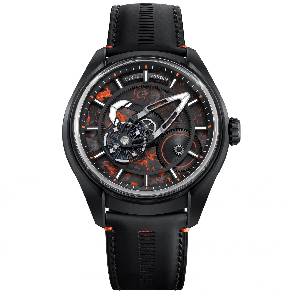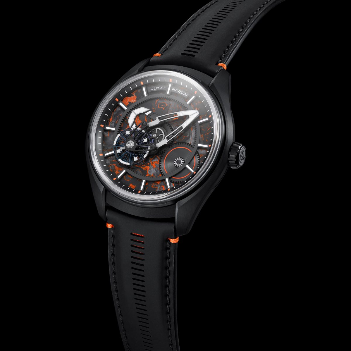 本機のアイデンティティを決定づけるのは、“自由”や“エネルギー”といった「ガムボール 3000」の精神を象徴するブラックとオレンジのカラーコンビネーションだ。ブラックDLCチタン製ケースに、オレンジで随所を彩ったアワーディスクを組み合わせ、そこにオレンジのインサートとステッチを施したブラックのラバーコーティングストラップを装備。アワーディスクには、航空宇宙産業から再利用した超軽量カーボンファイバーを原材料とする超高性能素材「カーボニウム®」を採用している。オレンジ色のエポキシ樹脂とカーボンファイバーを融合させた同素材は、ダマスカス鋼を彷彿とさせる独特のうねり模様を描き出し、二つとして同じ表情のディスクは存在しない。この軽量かつ堅牢なディスクが12時間で1回転することで時を指し示し、その上部ではブリッジなしで支えられたフライングカルーセルが1時間ごとに自転しながら、分を静かに刻んでいく。