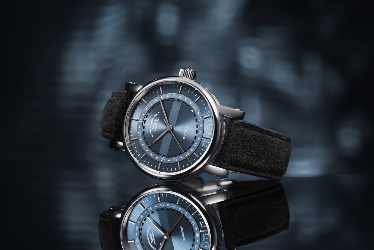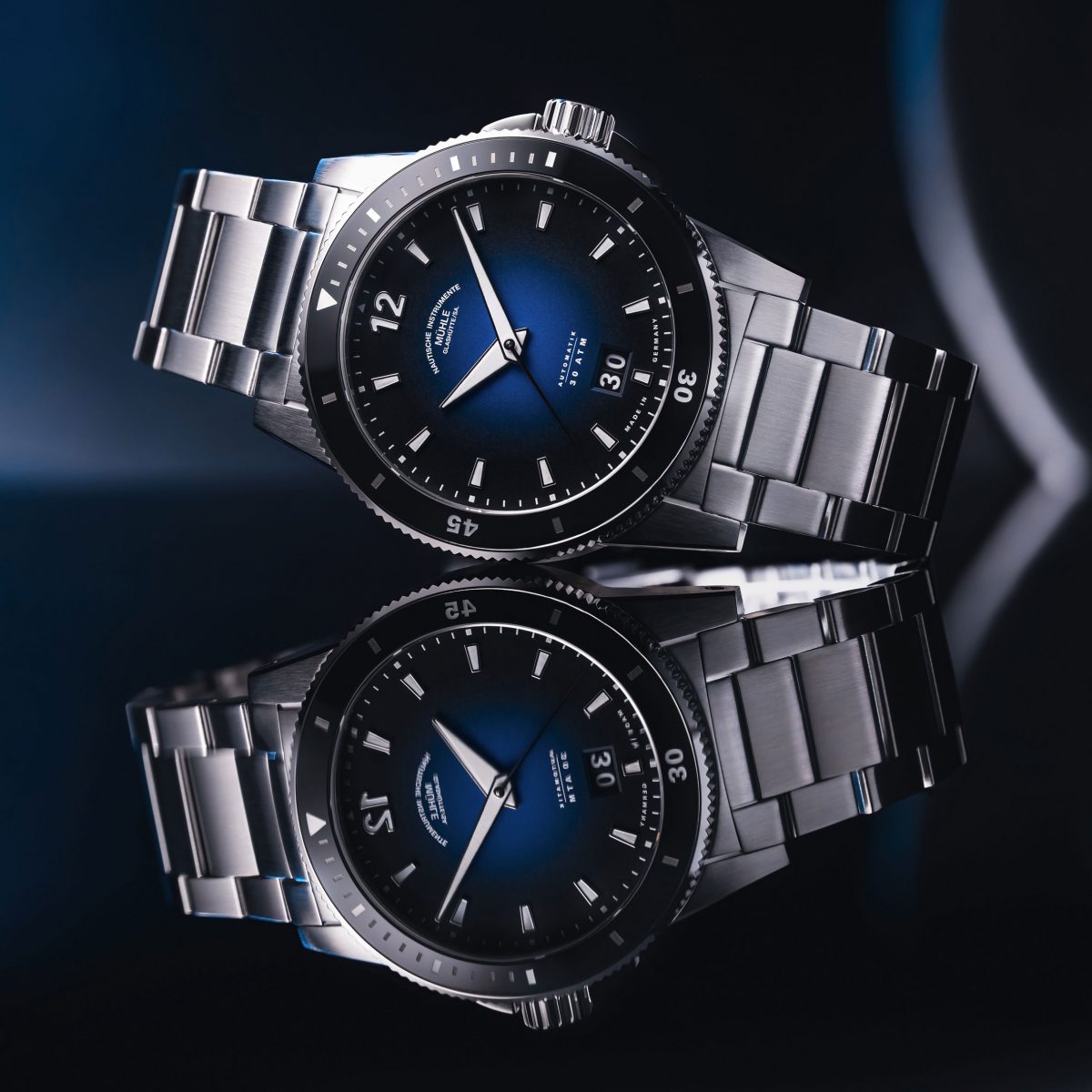 まず、ブランドを象徴するコンプリケーションを現代的に再構築したのが「Sportivo Big Date」だ。ミューレにとって「ビッグデイト」は単なる日付け表示ではなく、自社専用モジュール「MU9424-GD」を開発するに至ったブランドを象徴する機構だ。本機では、その技術が深海へと潜行するかのようなブルーのグラデーションダイヤルと組みわせたことで、より洗練された形で表現されている。直径42.5mm、厚さ12.5mmのステンレスケースにはブラックセラミックベゼルが装備され、30気圧防水という本格スポーツ仕様でありながら上質な仕上げも特徴。内部には耐衝撃ウッドペッカーネック微調整機構を備えた自動巻きムーブメント「キャリバー MU9424-GD」が収まり、パワーリザーブは約41時間を確保する。メタルブレスレット仕様、レザーストラップ仕様、テキスタイルストラップ仕様の3種類が用意されている。