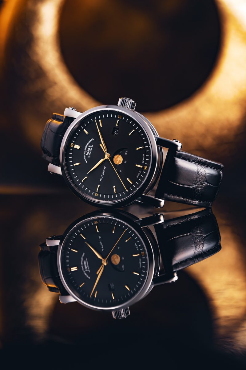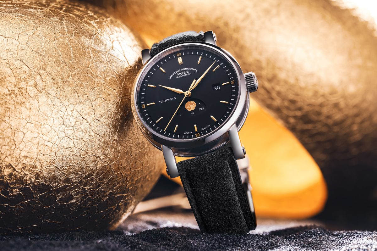 クラシックなムーンフェイズを独自の哲学で再解釈したのが「Teutonia IV Moonphase」だ。アンスラサイトダイヤルにゴールドプレート仕上げの針とインデックスが映え、直径10mmのディスクが月の満ち欠けをロマンチックに描き出す。直径41 mmのケースは10気圧防水のスペックを持ち、ドーム型の両面無反射サファイアクリスタルを装備。内部には、6姿勢調整により日差0から+8秒という高い実用精度を実現した自動巻きムーブメント「キャリバー SW 280-1」を搭載する。メタルブレスレット仕様、レザーストラップ仕様、スエードストラップ仕様の3種類が展開される。