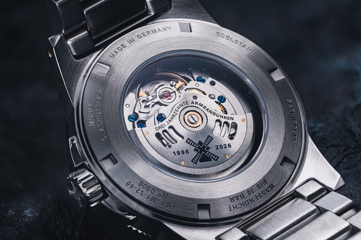 ミューレ・グラスヒュッテが、ドイツ・グラスヒュッテの地で産声を上げたのが1869年。マリンクロノメーターや船舶用時計の製造を経て、1996年に開始された腕時計製造は2026年で30周年という大きな節目を迎える。この記念すべき年に発表される新作4モデルには、アニバーサリーを祝う共通の意匠として、2026年製造分のみに許された「Three Decades of Wristwatches」特別仕様ローターが搭載される。