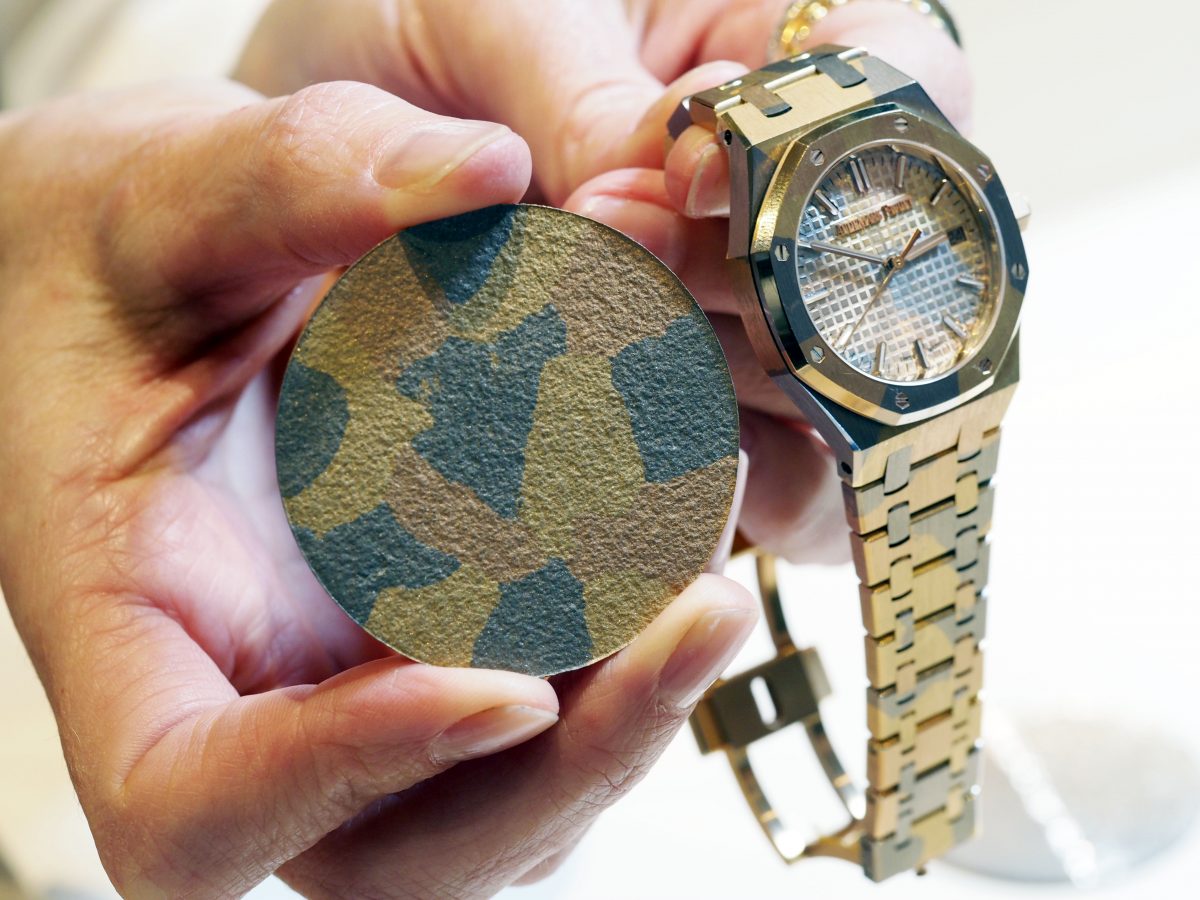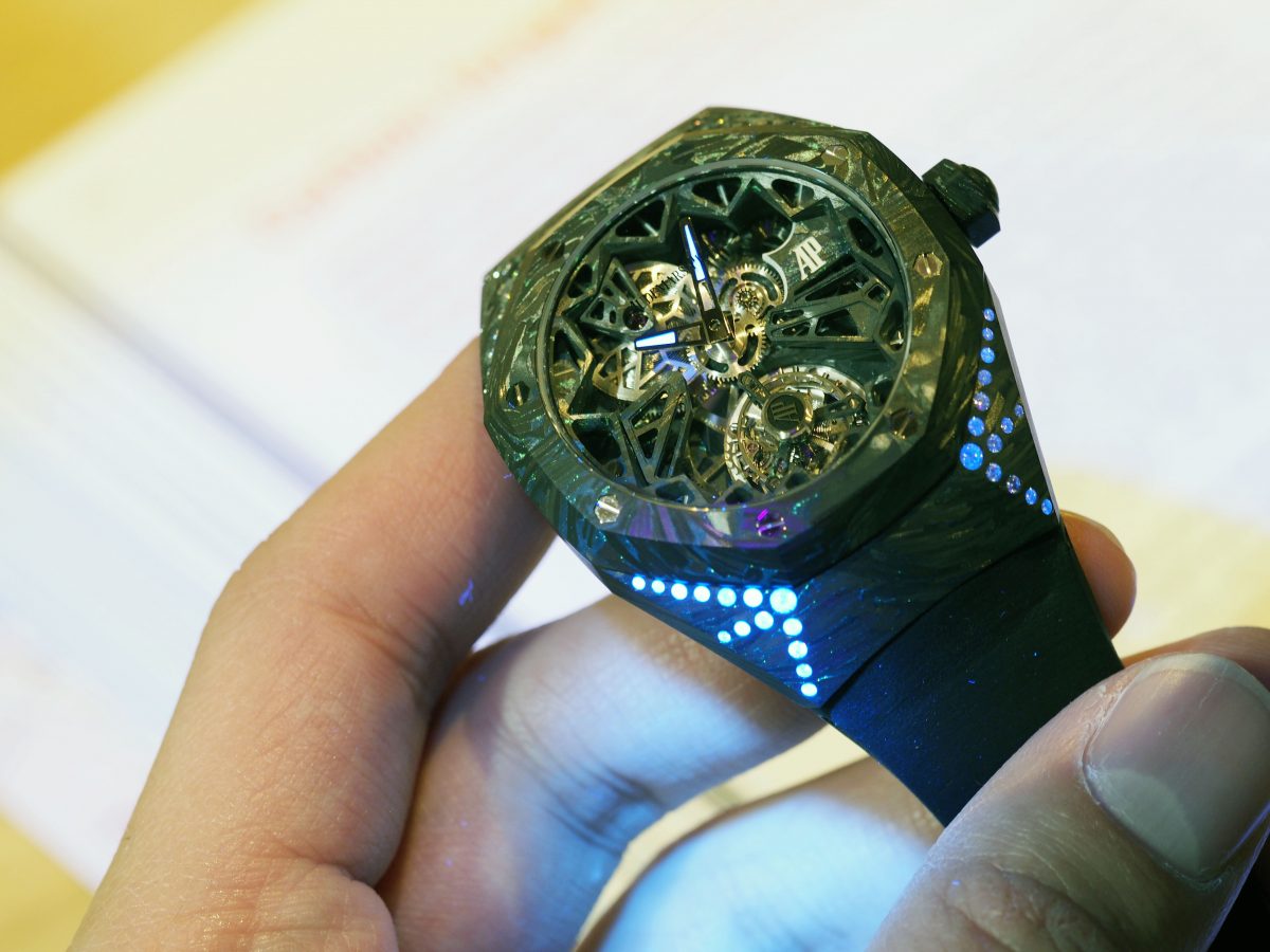 アンデルマットの会場で披露されたのは、今年の新作だけではなかった。近い将来製品化されるであろうプロトタイプも複数プレゼンテーションされた。それらが特徴とするのが、マルチカラーのセラミックや18金、蓄光材を混ぜ込んだ発光するフォージドカーボンといった新素材である。PG・YG・ロジウムメッキを施さない無垢のWGを融合させた新18金は、「ロイヤル オーク」のケースとブレスレット、さらにダイヤルにも使われて、ゴールドの迷彩模様と呼べるような不思議な外観を表していた。光るフォージドカーボンはジェムセッティングと組み合わせ、ダイヤモンドが光を透過して煌めく華やかさをまとっている。ムーブメントも組み込まれた、これらプロトタイプは、真の意味でオーデマ ピゲの新たな150年の始まりを象徴する。