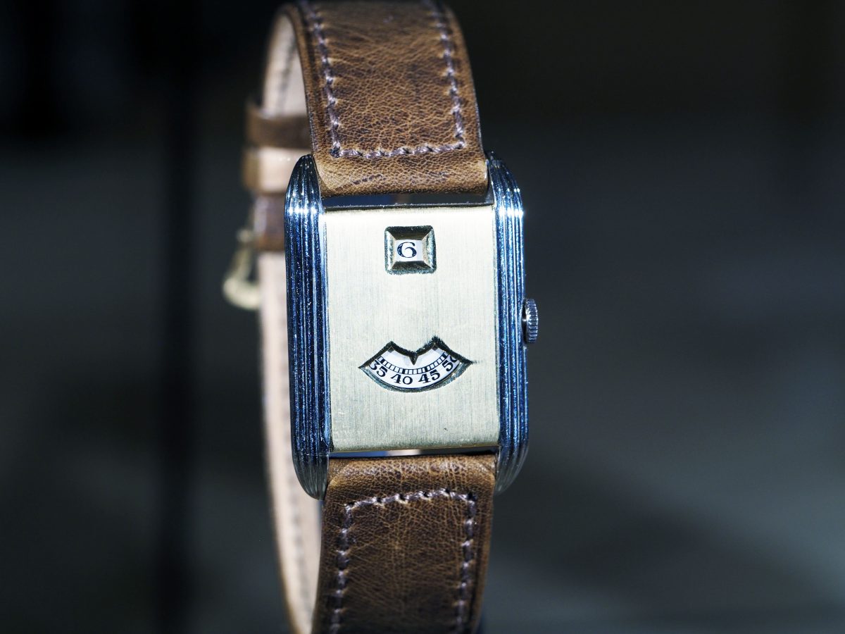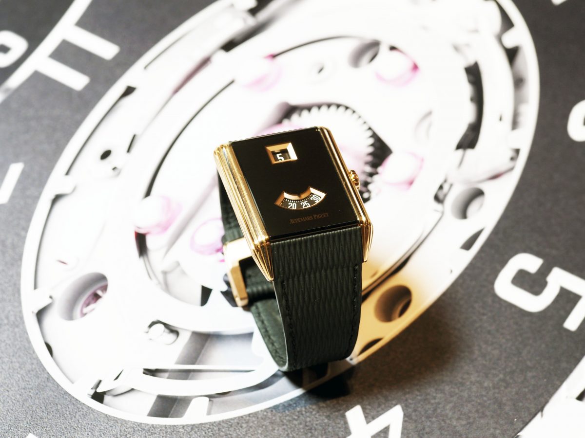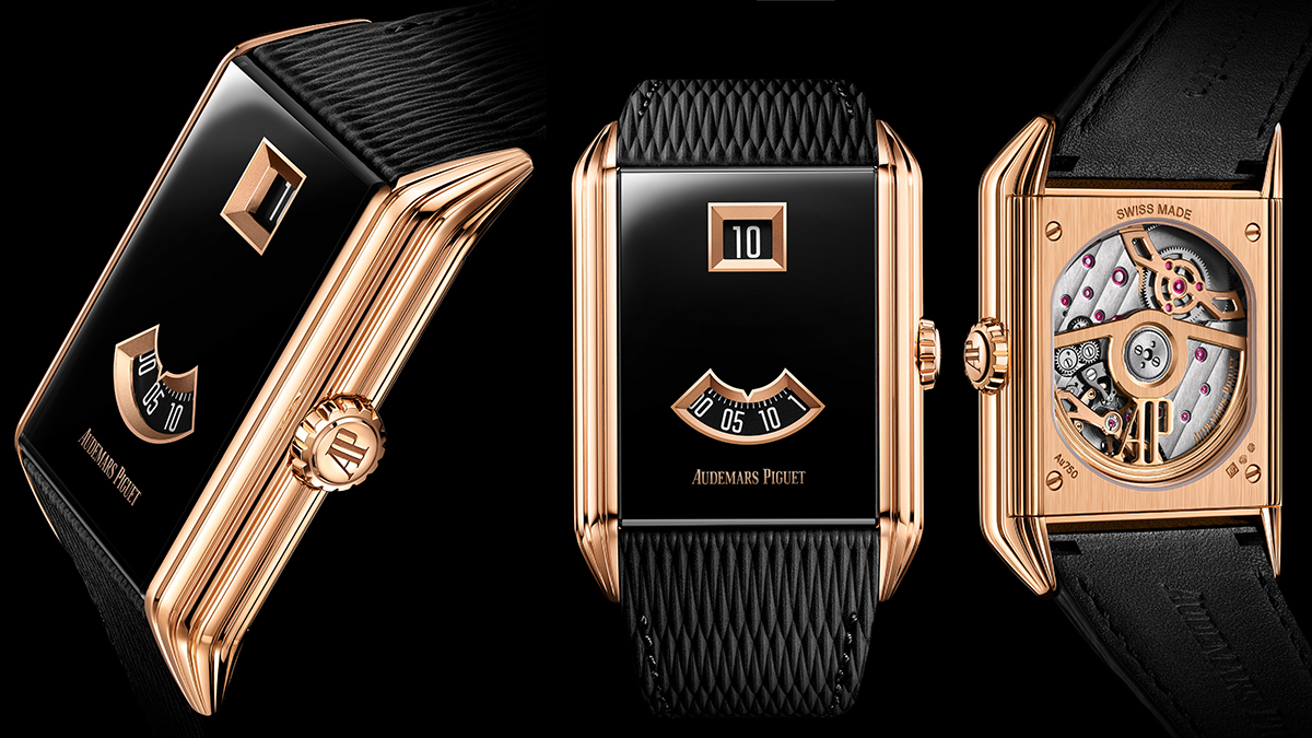 展示された歴史的タイムピースの中には、オーデマ ピゲが1924年に腕時計でいち早く実現したジャンピングアワー+ディスク式分表示が備わるバリエーションの1つがあった。その1929年製モデルをモチーフに、同機構が久しぶりにメゾンに帰還した。新作「ネオ フレーム ジャンピングアワー」は、オリジナルと同じくケース両サイドをアール・デコを象徴するゴドロン装飾で華やいだ流麗なフォルムが、実に美しい。ムーブメントは、「ロイヤル オーク “ジャンボ” エクストラ シン」に使われる極薄自動巻きCal.7121に新開発のジャンピングアワー・モジュールを組み合わせたCal.7122を搭載。同機構では異例のケース厚8.8mmという薄さを実現してみせた。さらに前面は、鉄仮面状だったオリジナルの姿を継承しながらサファイアクリスタル風防にブラックPVDを施すことで、精悍かつエレガントな金黒の外観を創出。モデル名に冠した“ネオ”は、これが1929年製モデルの単なる復刻ではなく、機構も外装もはるかに進化さているという自負の現れである。