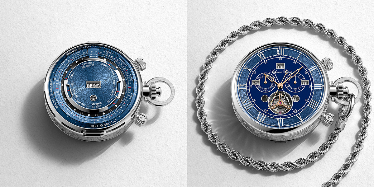 「RD#4」のために開発されたCal.1000を懐中時計用に手巻き化するなどして改良した、新型Cal.1150を搭載。ソヌリやトゥールビヨン、スプリットセコンド・フライバッククロノグラフなど22もの複雑機構を1つに統合してみせた。さらに開閉式のケースバックには、メゾン初のユニバーサルカレンダーを装備する。これは裏蓋を開くとその背面に現れるディスク状の巨大なリューズで操作する、いわば万年カレンダーである。リューズを回してダイアル中央の西暦を設定すると、その年の暦と月齢周期に切り替わる仕組み。西暦は1900~2099年までプログラミングされ、正確な月齢周期と連携して太陽・太陰暦に基づくラマダンや春節の時期なども一目瞭然とする革新的なメカニズムが潜んでいる。Cal.1150に備わる複雑機構とも相まって、昨年迎えた創業150周年の集大成にして、さらに次なる150年も進化を続けるというメゾンの決意が込められた、まさに超大作である。
