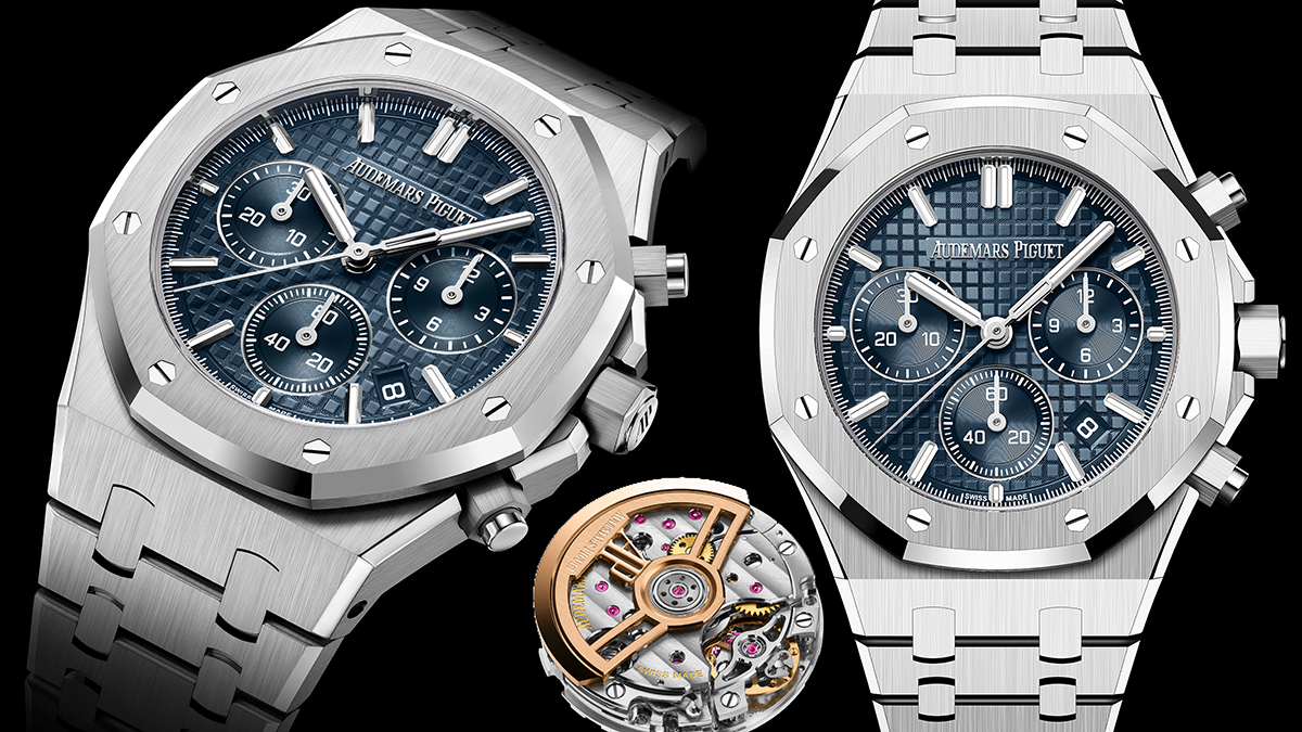 さらに今年のオーデマ ピゲは、既存モデルのブラッシュアップにも手抜かりはない。中でも「ロイヤル オーク クロノグラフ」は、会場で大きな関心が寄せられた1つだった。ケース径は、小ぶりな38mm。既存モデルにもあり、外観も大きな変化はないが、ついに完全自社製搭載となったのだ。これまで38mmのクロノグラフに使われてきたのは、スイス製で垂直クラッチを先駆けたフレデリック・ピゲ製の薄型自動巻きの傑作Cal.1185を自社で仕上げ直したCal.2385であった。それに代わる新型Cal.6401は、自動巻きで垂直クラッチ+コラムホイールであるのは同じ。しかし振動数は毎秒6振動から8振動にハイビート化れ耐衝撃性と携帯精度が向上し、パワーリザーブも約40時間から55時間へと大幅に延長されている。自社製搭載となったことでケースバックはトランパレント化され、またダイヤル左右の積算計の針位置のバランスがより良好に整え直された。裏蓋から見える雄姿は、ブリッジのコート・ド・ジュネーブが浅く、高級機らしい控えめな美観が好ましい。機械的にも見た目の魅力を増した新型クロノグラフは、市場からも大歓迎されるだろう。