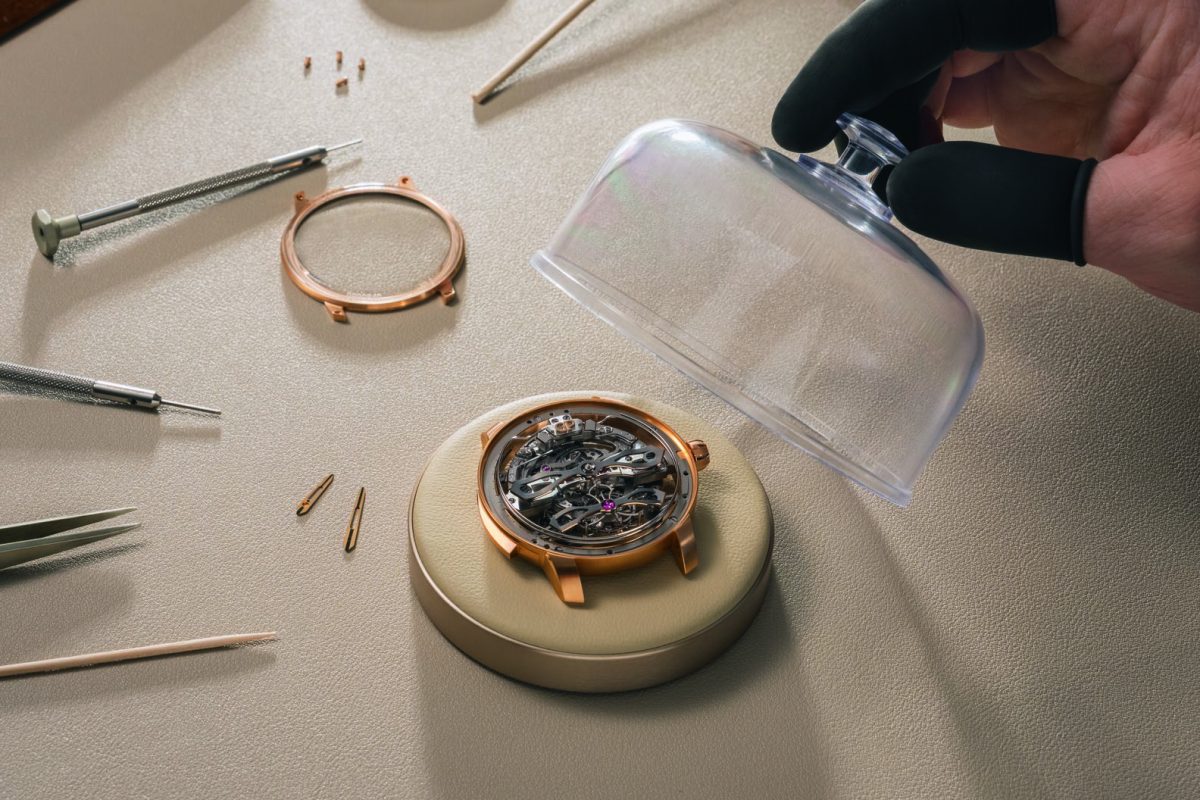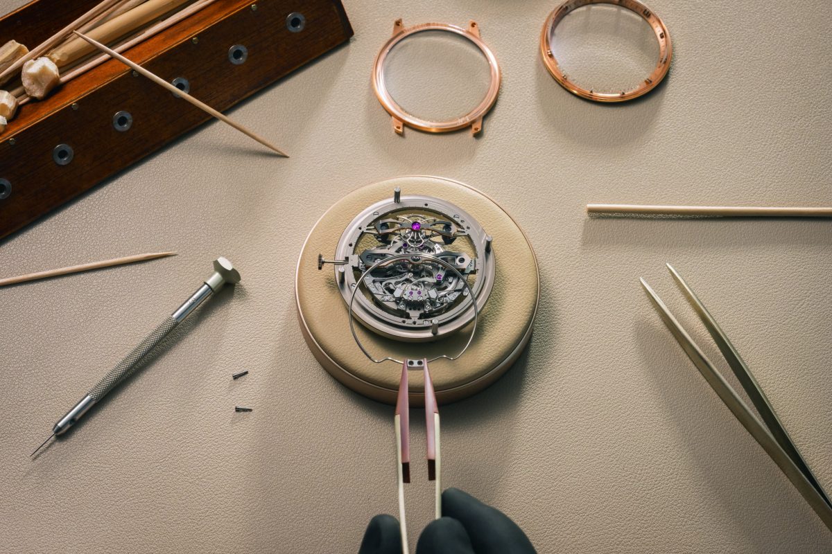 また本作の開発において、ブランドが特に注力したのはミニッツリピーターの音色である。時刻を音で知らせるだけでなく、その響きの純度、広がり、共鳴をいかに高めるか。この課題に対し、熟練の時計職人たちは緻密な計算に基づいた革新的な構造を採用した。