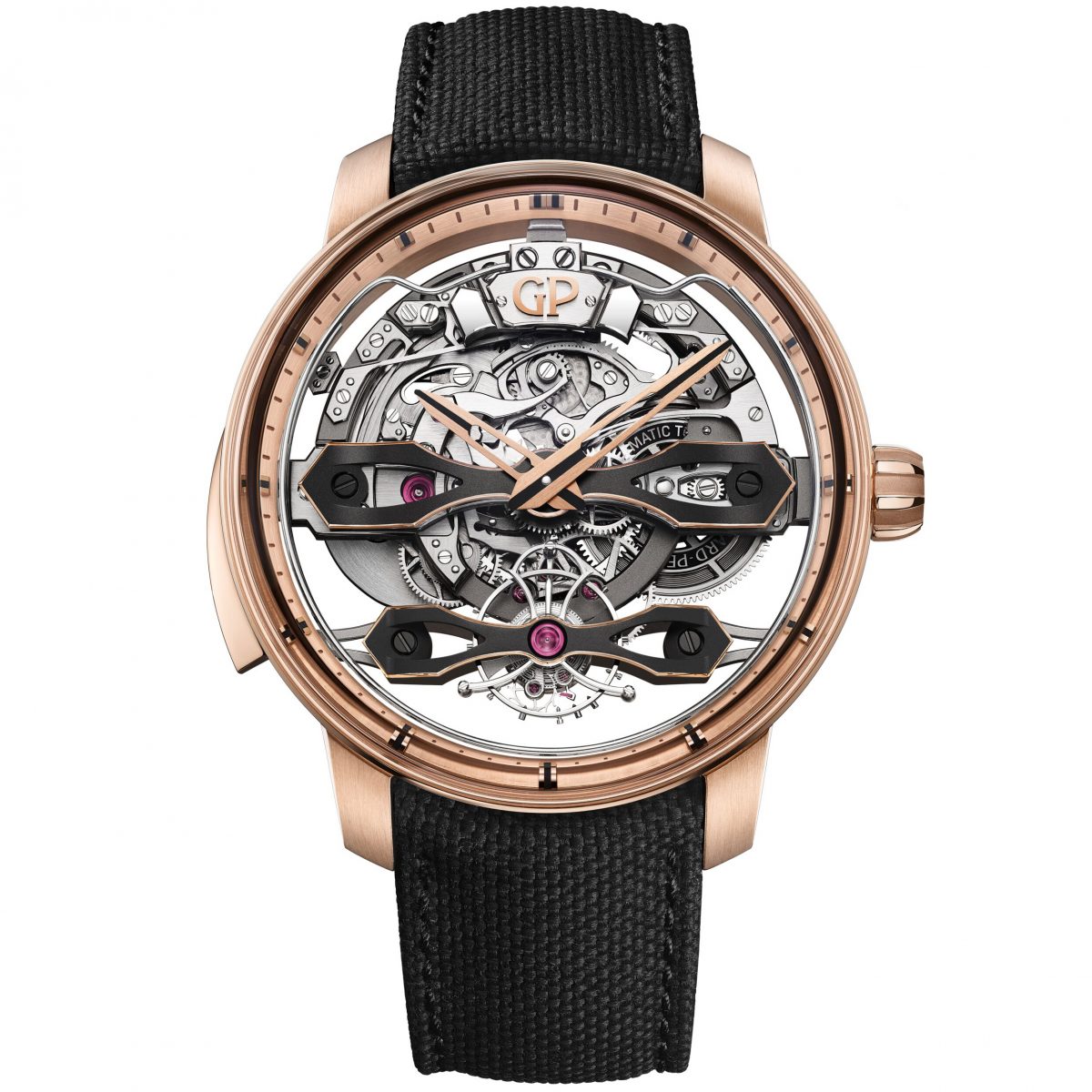 ジラール・ペルゴ「ミニッツリピーター フライングブリッジ」 Ref.99840-52-2013-5CC 8739万8300円/自動巻き(Cal.GP09530-2198)、毎時2万1600振動、約60時間パワーリザーブ。ピンクゴールドケース(シースルーバック)、ラバーストラップ。直径46mm、厚さ17.9mm。30m防水。