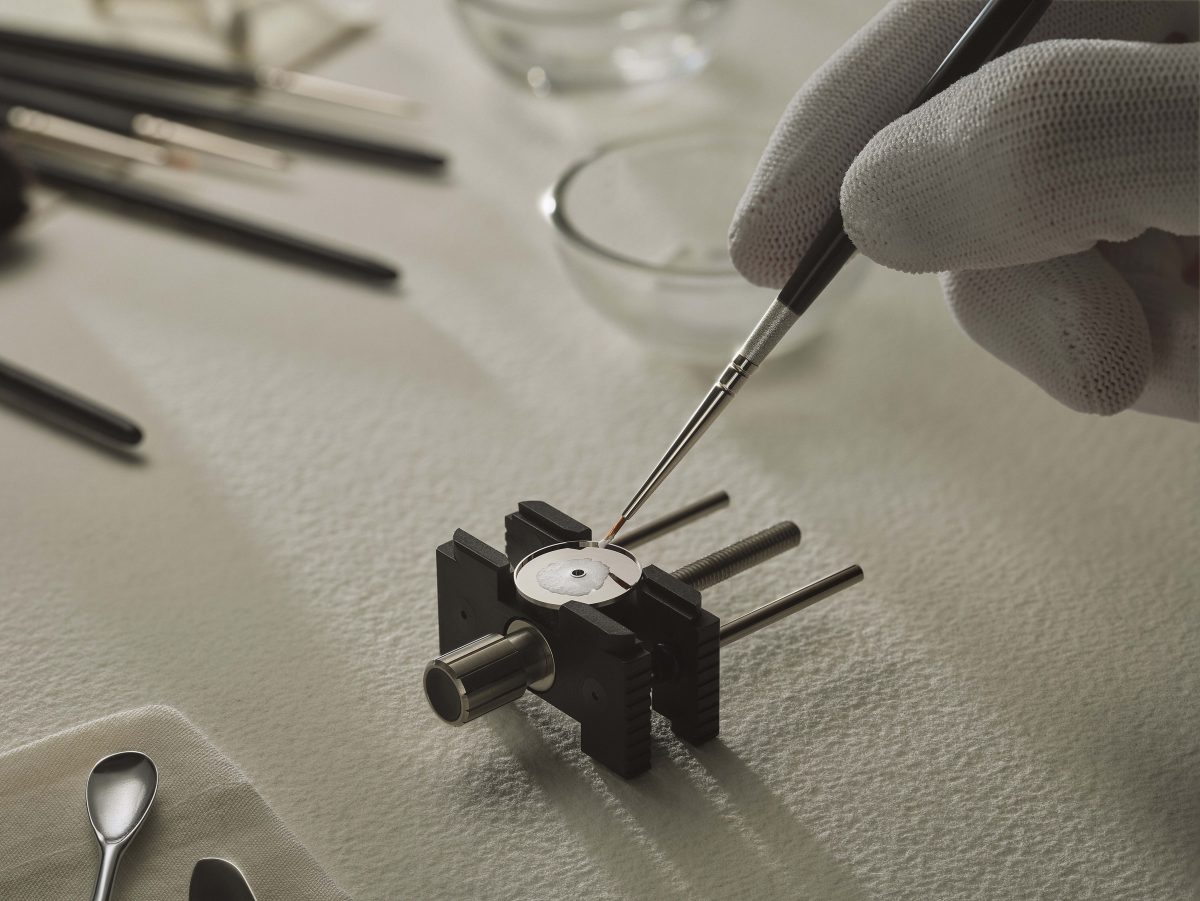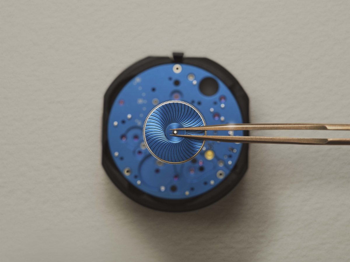 専用のムーブメントには、アンスラサイトグレーの香箱蓋のほか、ローズゴールドで彩られた歯車やテンプが採用されている。ホワイトエナメルと濃色のパーツが鮮やかなコントラストを描き、視線をメカニズムの深部へと誘うデザインも見事だ。
